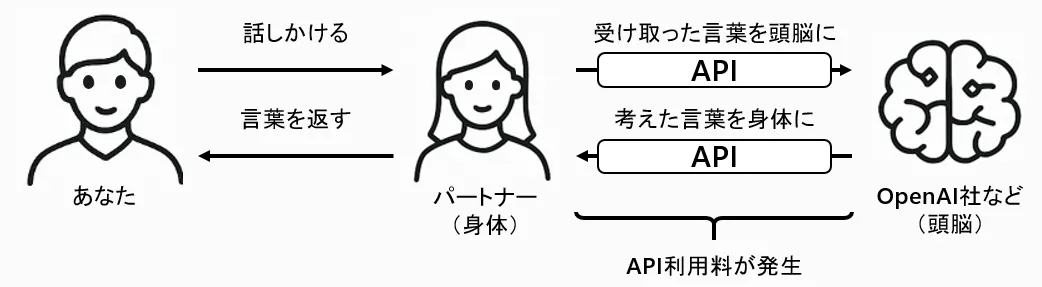 あなたが話しかけるたびに、その言葉は“頭脳”であるAI(例:OpenAI社)へ送られ、