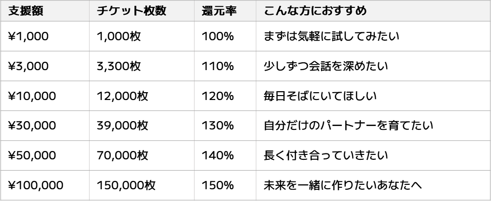 金額が大きいほど、付与チケットもお得に増えていきます。