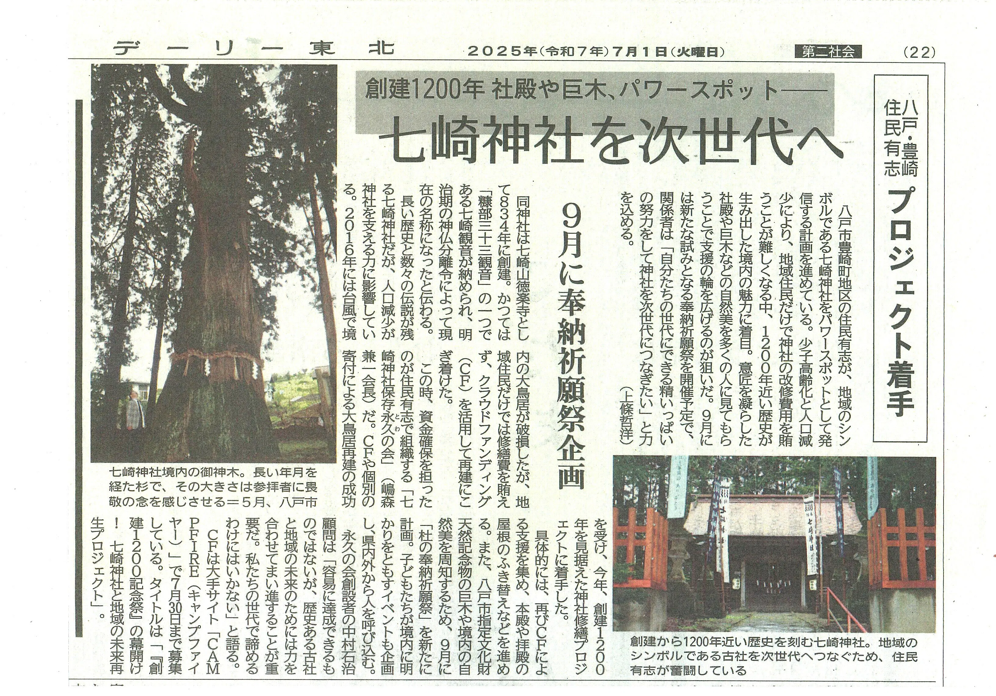 5月14日に拝殿にて行われた「七崎神社創建1200年記念奉祝祭」を見据えた「記者会見」の基本的概要が、地方紙【デーリー東北7月1日】に掲載されました。引き続き、CFの拡散とシェアに、ご協力をお願いたします。