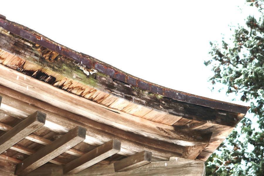 「東日本震災」や「台風10号」等、度重なる震災や台風などの天災で老朽化が進行し、雨漏り等を繰り返してきました。復興整備事業とは、被災した神社建造物の急務とする本殿・拝殿・摂社・神門などの「屋根葺き替え工事」と「被災した箇所の修復」です。