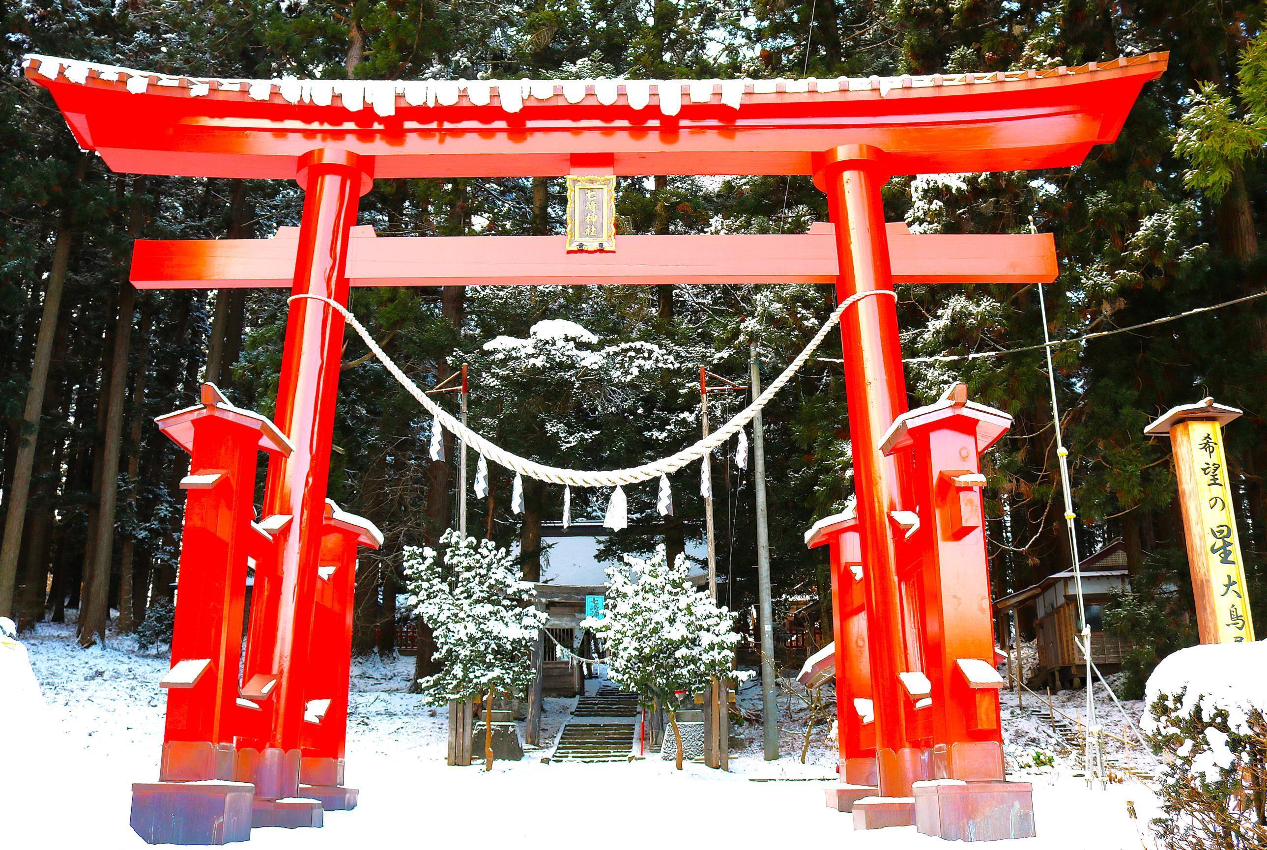 (東北最大の青森ヒバ木造両部鳥居)幅:13m、高さ:8.3m、笠木(最上部)の重量:3.2t