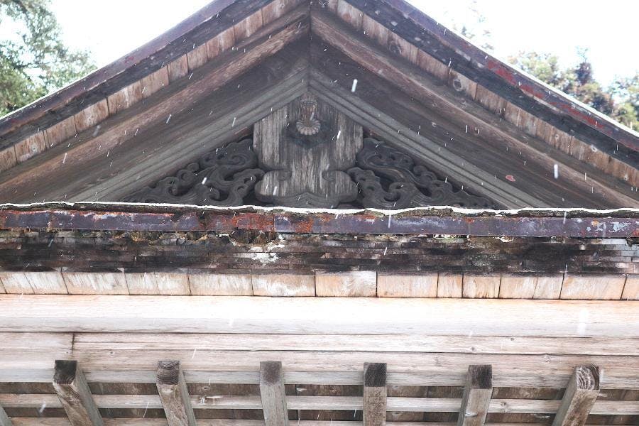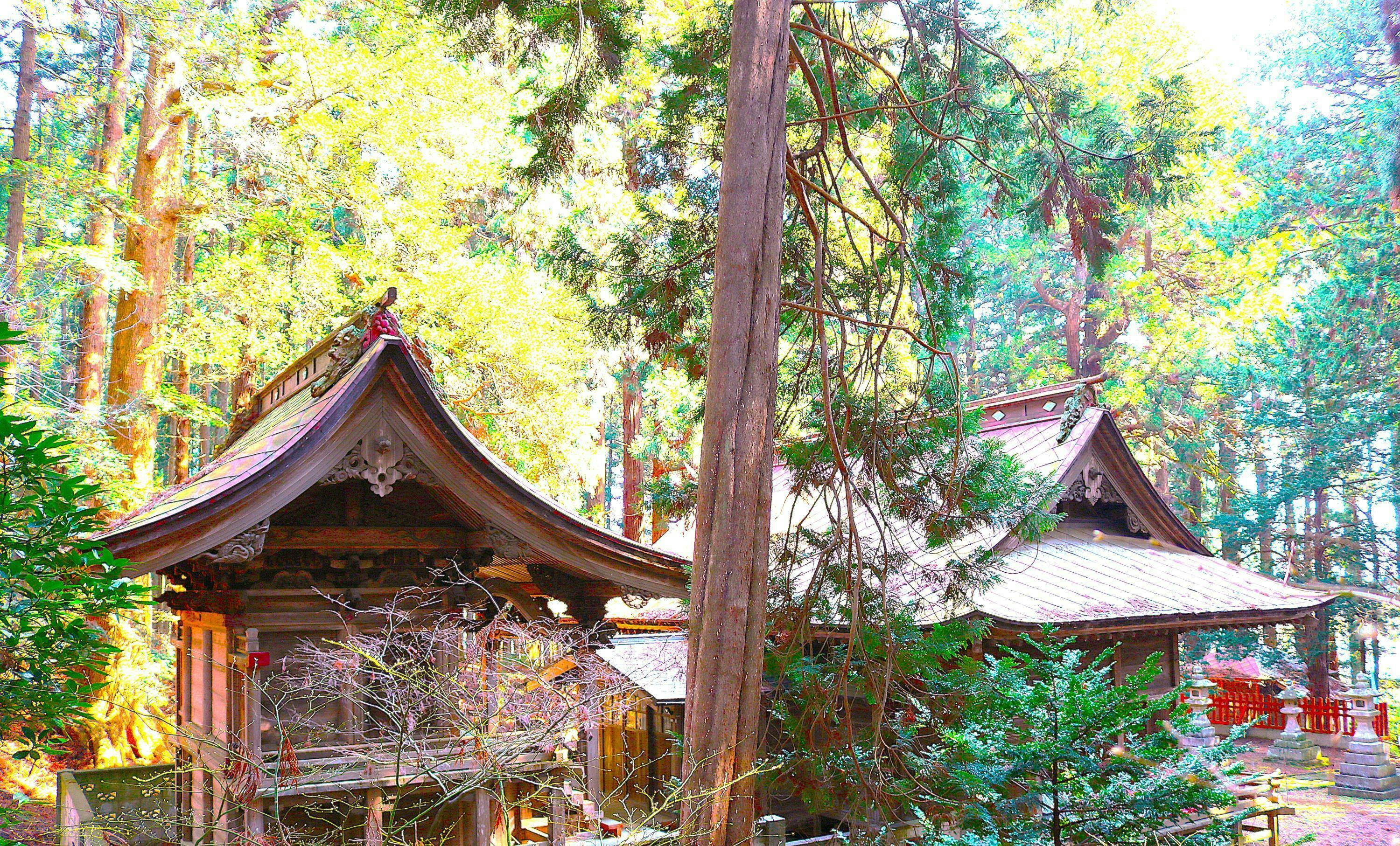 苔の生えた、古びた石畳の階段をのぼり、更に、100mほど上段へ進むと、太陽の日差が広がる諸神の領域「拝殿」にたどり着きます。そして、更に、奥に足を進め「本殿」を見た時、感銘するご参拝者がほとんどです。日本を代表する、宮大工の匠・日本の名工「清水福治」氏も「素晴らしい!」の一言です。