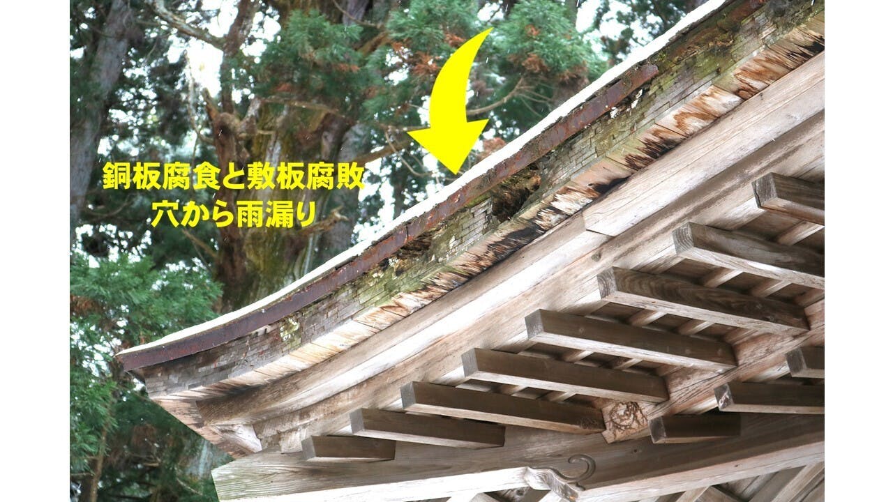 老朽化が進行する七崎神社の建造物は、度重なる震災(東日本震災)や巨大台風などの天災で、雨漏りを繰り返してきました。特に’22年の台風10号は観測史上はじめて”東北に直接”上陸した台風でした。
