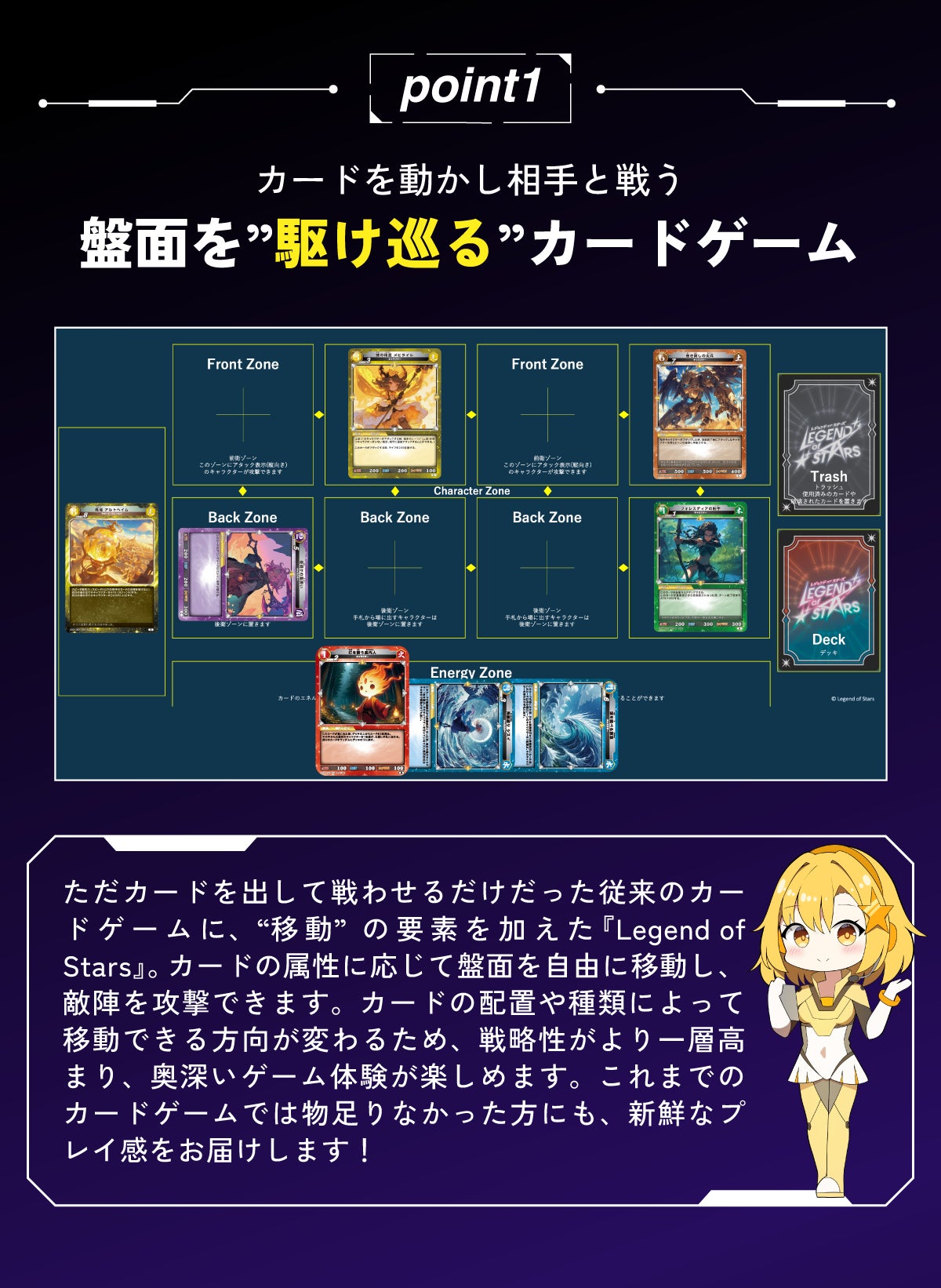 様々な"駆け引き"を創り出すことができるボードゲームと、自分だけのオリジナルデッキを作れる楽しさが魅力のカードゲーム。この2つの要素をうまく組み合わせ、”ボードゲームのように多くの道具を使わず、カードだけで駆け引きが成立するカードゲーム”として誕生したのが『レジェンド・オブ・スターズ』です。