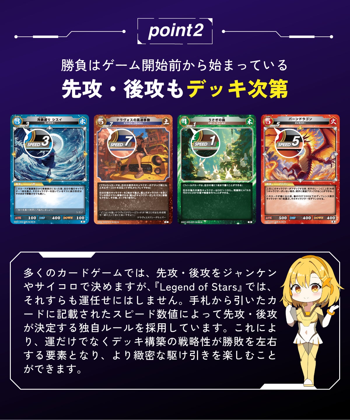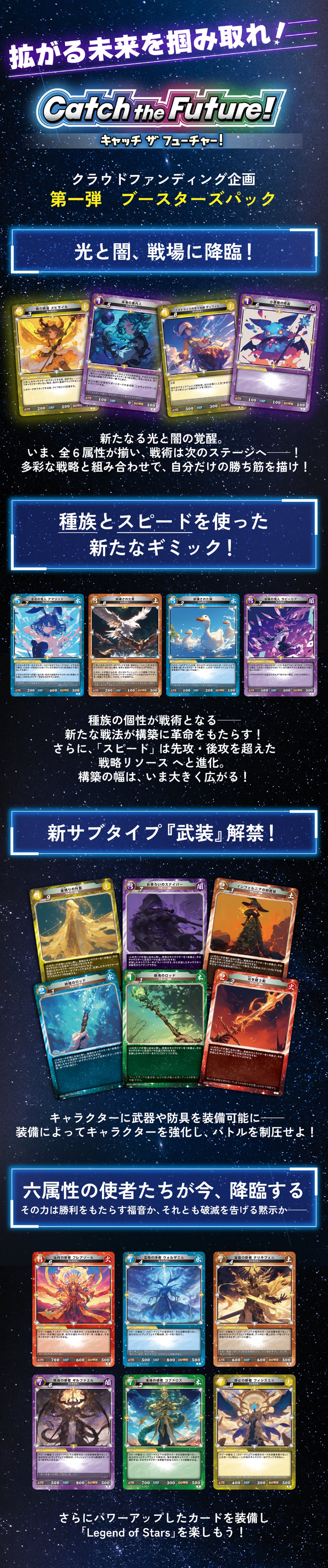 スターターデッキ4種の火・水・木・土属性に加え、新たに闇属性と光属性のカードが加わり6属性の幅広いカードの組み合わせでレジェンド・オブ・スターズを楽しんでください!