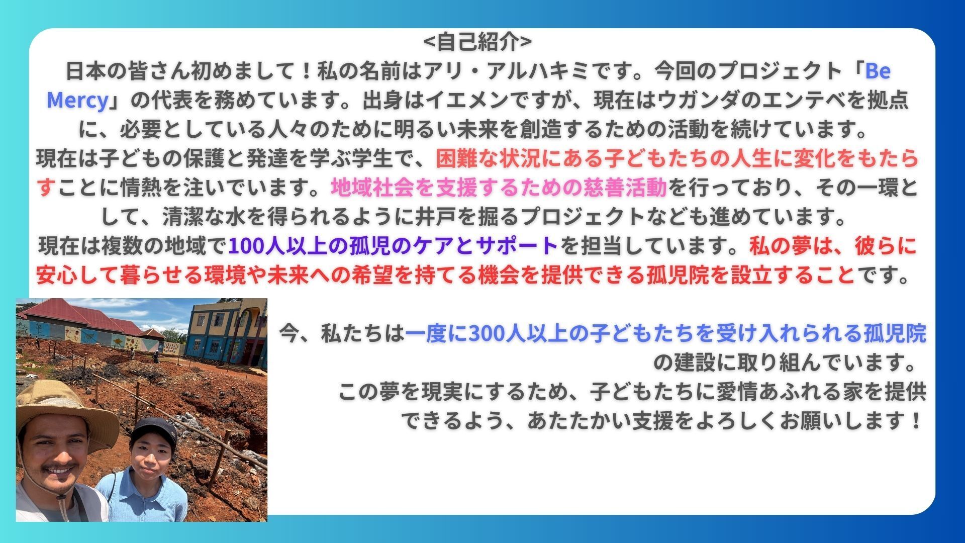 2025/07/01 21:37こんにちは、Be mercifulの青山です。この度は数あるプロジェクトの中、ウガンダの孤児たちの生活を守るためのプロジェクトにご支援いただき誠にありがとうございます。お陰様で217,000円の資金を皆様より募ることができました。目標金額まではまだまだ遠く、クラウドファンディングの難しさを代表アリと共々に痛感しているところでございますが、一方で、活動に賛同し、応援していただいた日本人の皆様がこれだけいること、大変心強く思っております。孤児院完成まではまだ時間がかかりますが、まずはこの資金で次のステップに進めていきたいと思います。現地の建設現場の状況はまた後日ご報告申し上げます。それでは引き続きよろしくお願いいたします。アリ・青山 もっと見る