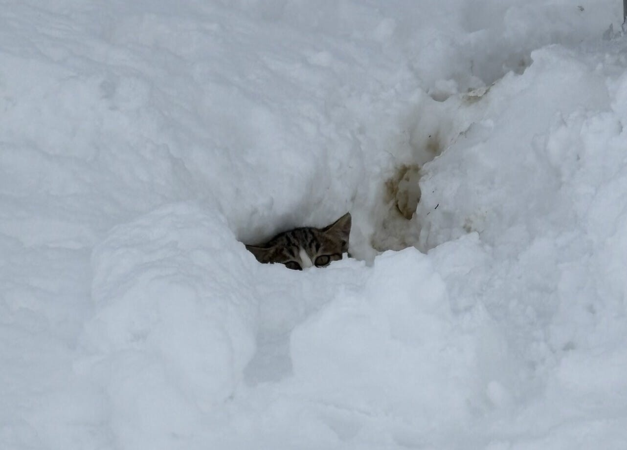 雪で埋まった側溝から顔を出す子猫達は近くに用意した小屋で休んでくれている子達です。