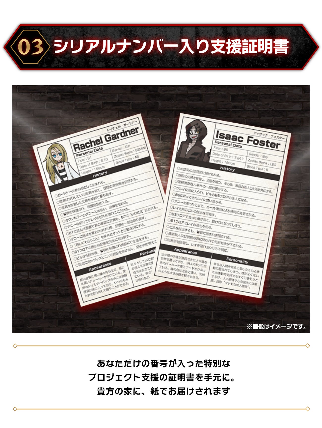 この「10周年記念プロジェクト」に参加した証としてください。デザインについては、よくある表彰状のような証明書ではなく……『殺戮の天使』でエディがファイリングしていた罪人たちの「履歴書」を模して作る予定です。