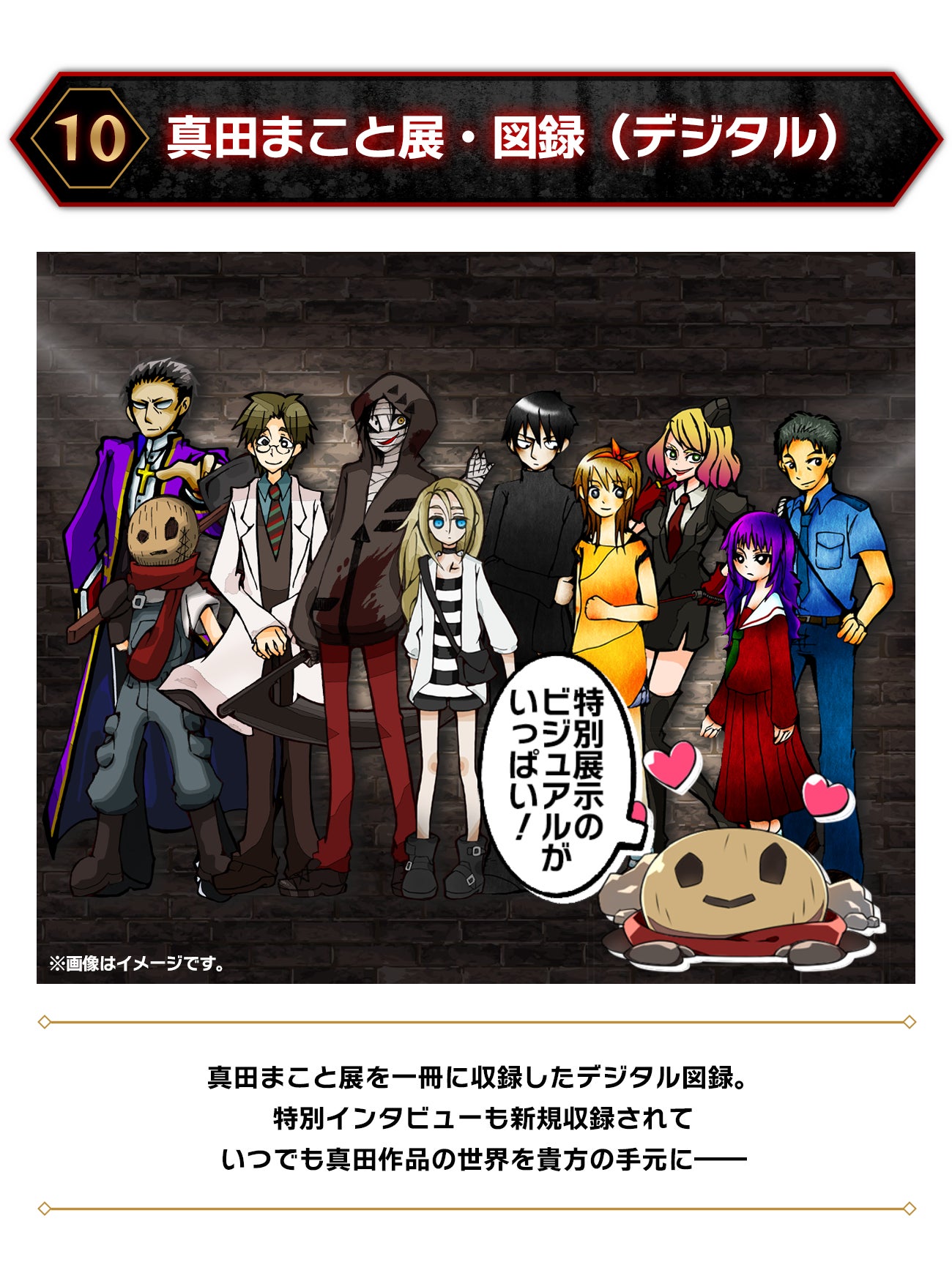 10人のキャラクターたちが一堂に会した、まさに10周年にふさわしい記念の一品。ずっとお部屋に飾っておける記念品として、大切にしてください。