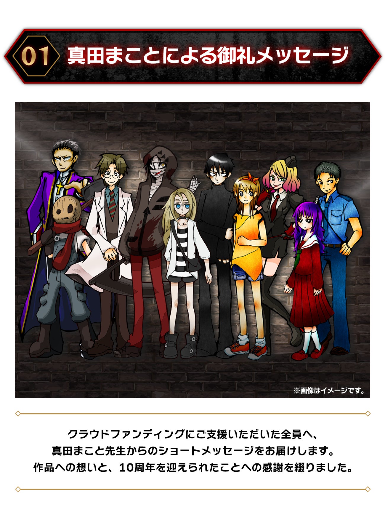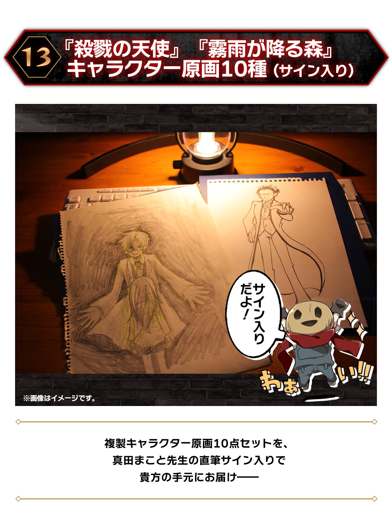 また、それでもなおイベント運営費用として全て使い切るのが難しいレベルの支援額をいただけた場合には……その資金に応じた追加企画や、グッズフェアや映像化などのメディアミックスを、真田まこと先生及び、これまで『殺戮の天使』や『霧雨が降る森』を盛り上げてきたメンバーで実現していこうと思います。