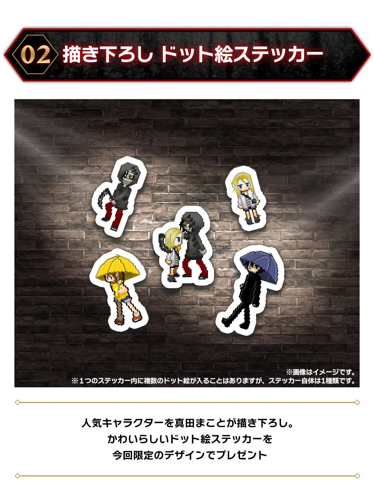 オシャレなドット絵でキャラクターが描かれた今回限りの限定デザインで、1枚の中に複数名のキャラが描かれています。日常の中に作品世界を取り入れられる特別なアイテムなので、ぜひパソコンやスマホなど好きな場所に貼り付けて使ってください。