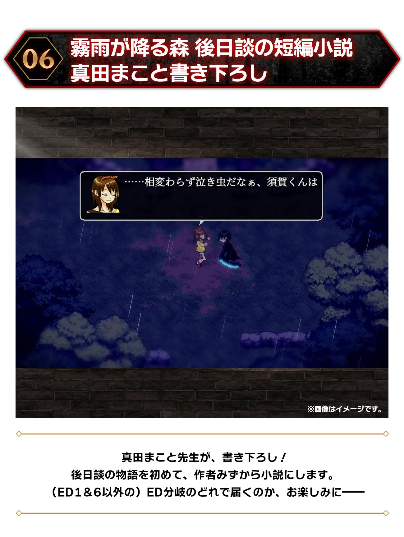 それが今回、そのうちの一つについて……真田まこと先生による後日談の書き下ろし小説の制作が決定しました。たぶん、皆さまの心をぐしゃぐしゃにしてくれる、残酷で美しい物語が展開するのではないかと思います。ぜひ今回のための特別なプレゼント――楽しみにしていて下さい。