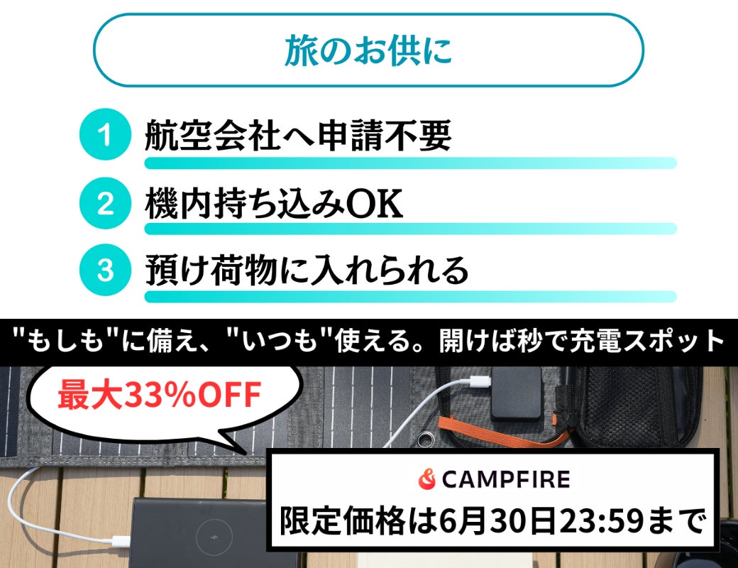 【LUM POCKET プロジェクト 終了のご報告と御礼】6月30日(月)23:59をもちまして、CAMPFIREにて実施しておりました折りたたみ式ソーラーパネル「LUM POCKET」プロジェクトは無事に終了いたしました。ご支援・応援くださった皆さま、そして最後までプロジェクトにご注目いただいた皆さまへ、心より感謝申し上げます。LUM POCKETの可能性とニーズの広がりを改めて実感することができました。いただいたご支援は、今後の生産・梱包・配送に向けて大切に活用させていただきます。お届けは【8月〜9月】を予定しております。準備の進捗などは、引き続き活動報告等でお知らせいたします。“電気を持っていく”から“電気をつくる”という選択へ。LUM POCKETが、皆さまのアウトドアや日常、そして万が一の災害時において、安心と自由をお届けできる存在になることを願っています。改めまして、この度は本当にありがとうございました。今後とも、どうぞよろしくお願いいたします。LUM POCKET正規販売代理店よろず兎LUM GUARD公式LINE:https://lin.ee/X27ZyQR公式LINEでは、最新情報を配信中です。