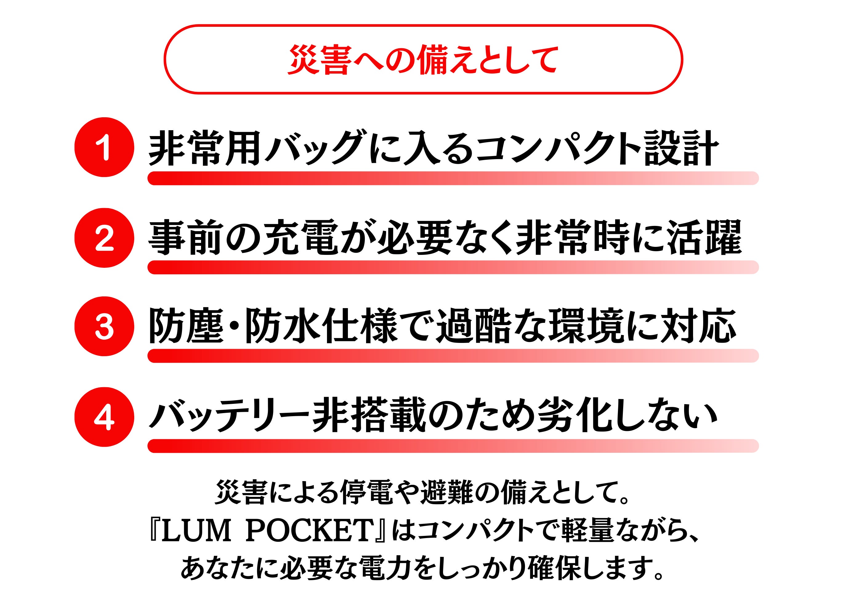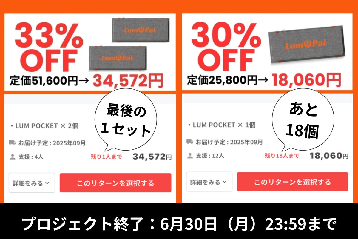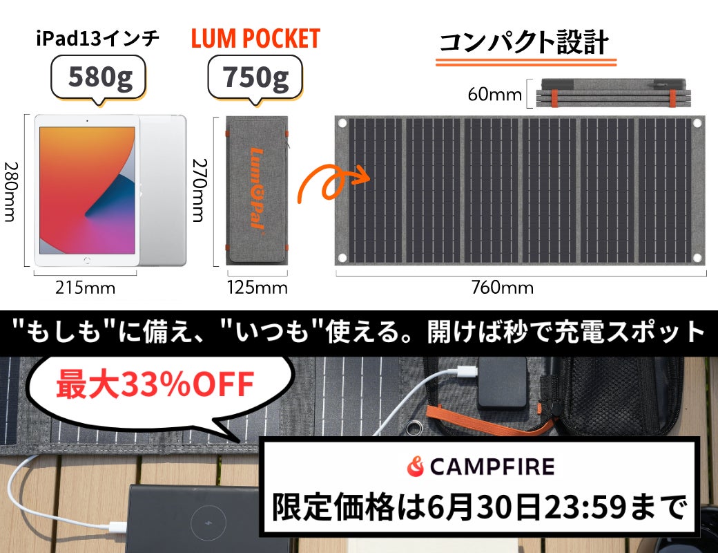 子供とのキャンプも安心。持ち運べる充電スポットの心強さ家族でのキャンプ、楽しいけれど電源の確保って、意外と悩みどころ。「スマホのバッテリー残量が気になる」「ゲーム機やLEDランタンも使いたい」そんな時に、LUM POCKET ラム ポケットの出番です。太陽さえあれば、スマホ・バッテリー・ライトなどUSBデバイスをしっかり充電!防塵防水設計で急な雨もOK。止水ポケットにスマホを入れて充電できます。プロジェクト終了:6月30日(月)23:59までお届け予定:8月〜9月プロジェクトページhttps://camp-fire.jp/projects/840320/preview公式LINE https://lin.ee/zQzQLAr 公式Instagram https://www.instagram.com/lum_pocket_japan公式X @LumPocketJapan LUM POCKET開封動画 https://youtu.be/bXsdLlMYmcg