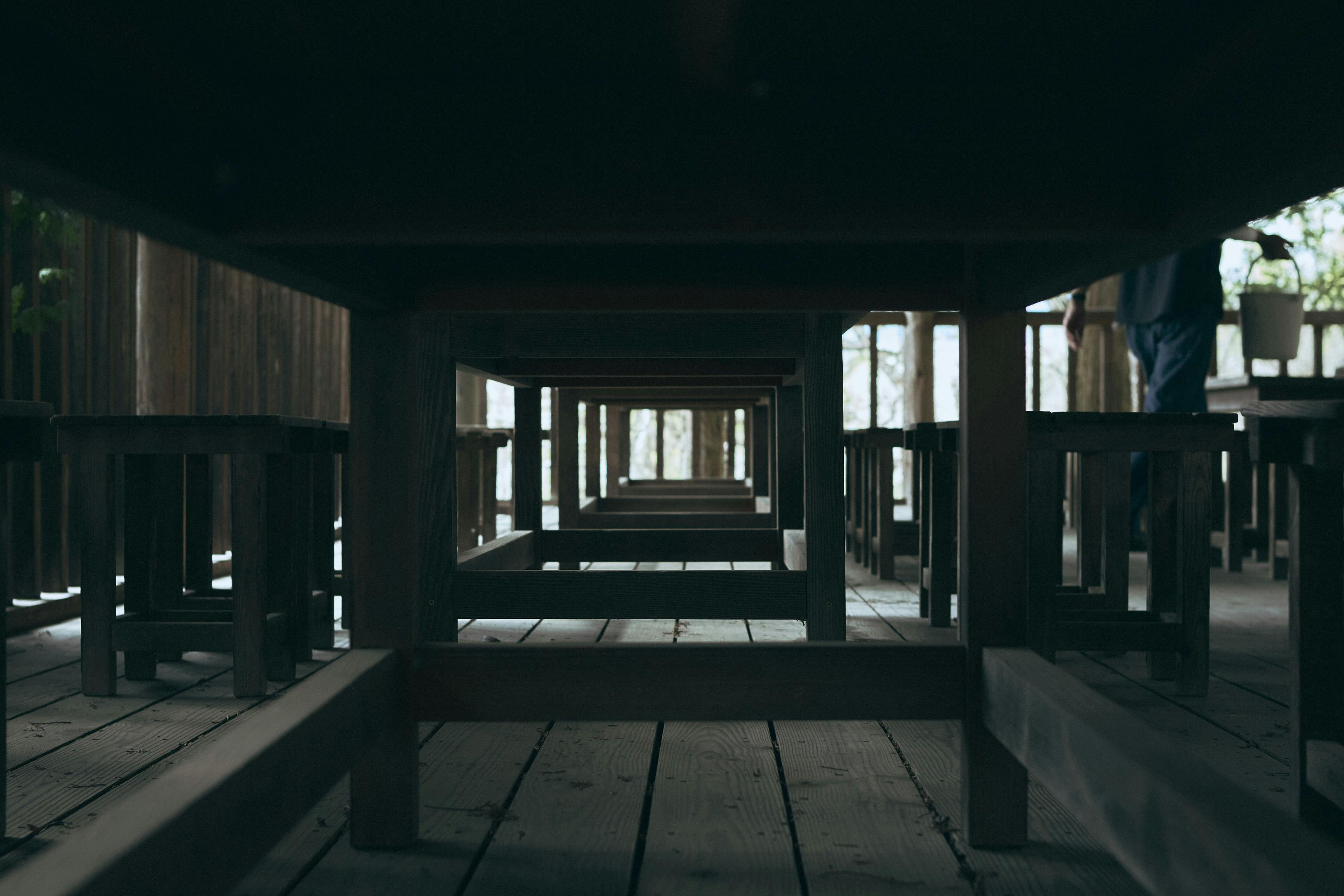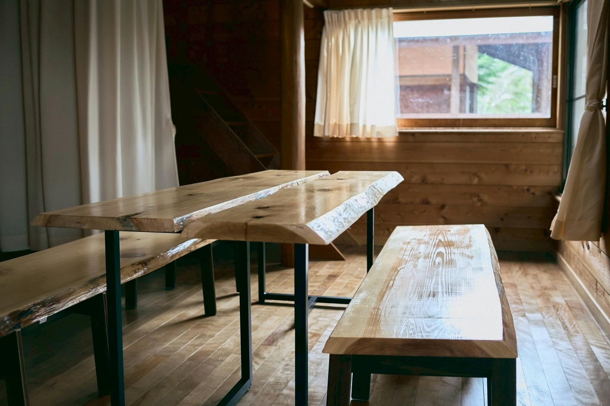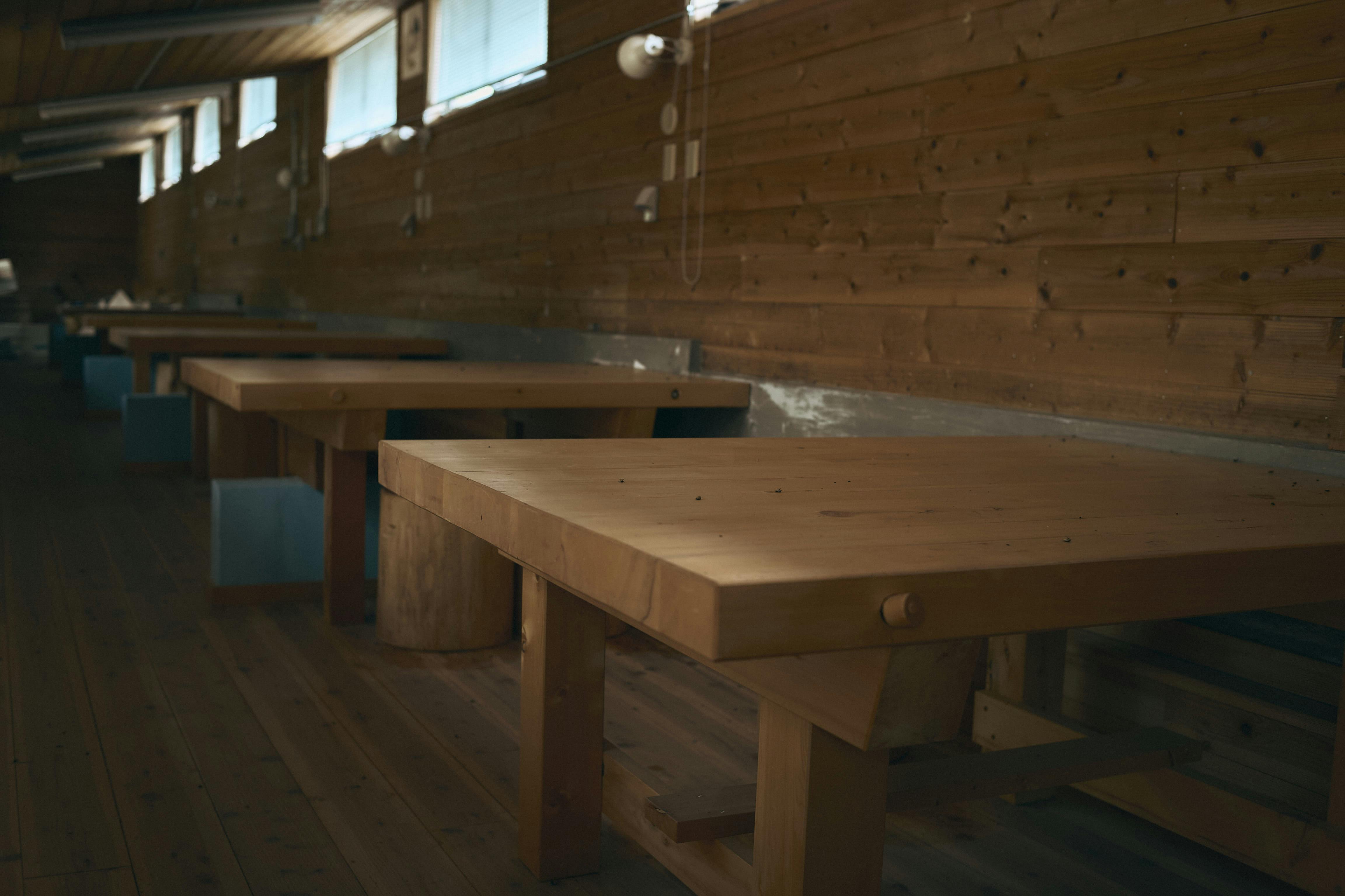 ボランティアの皆さまと、井口が心を込めて手作りした、天然木曽檜(ヒノキ)の一枚板を贅沢に使用したテーブルと椅子で、皆さまをお出迎えします。