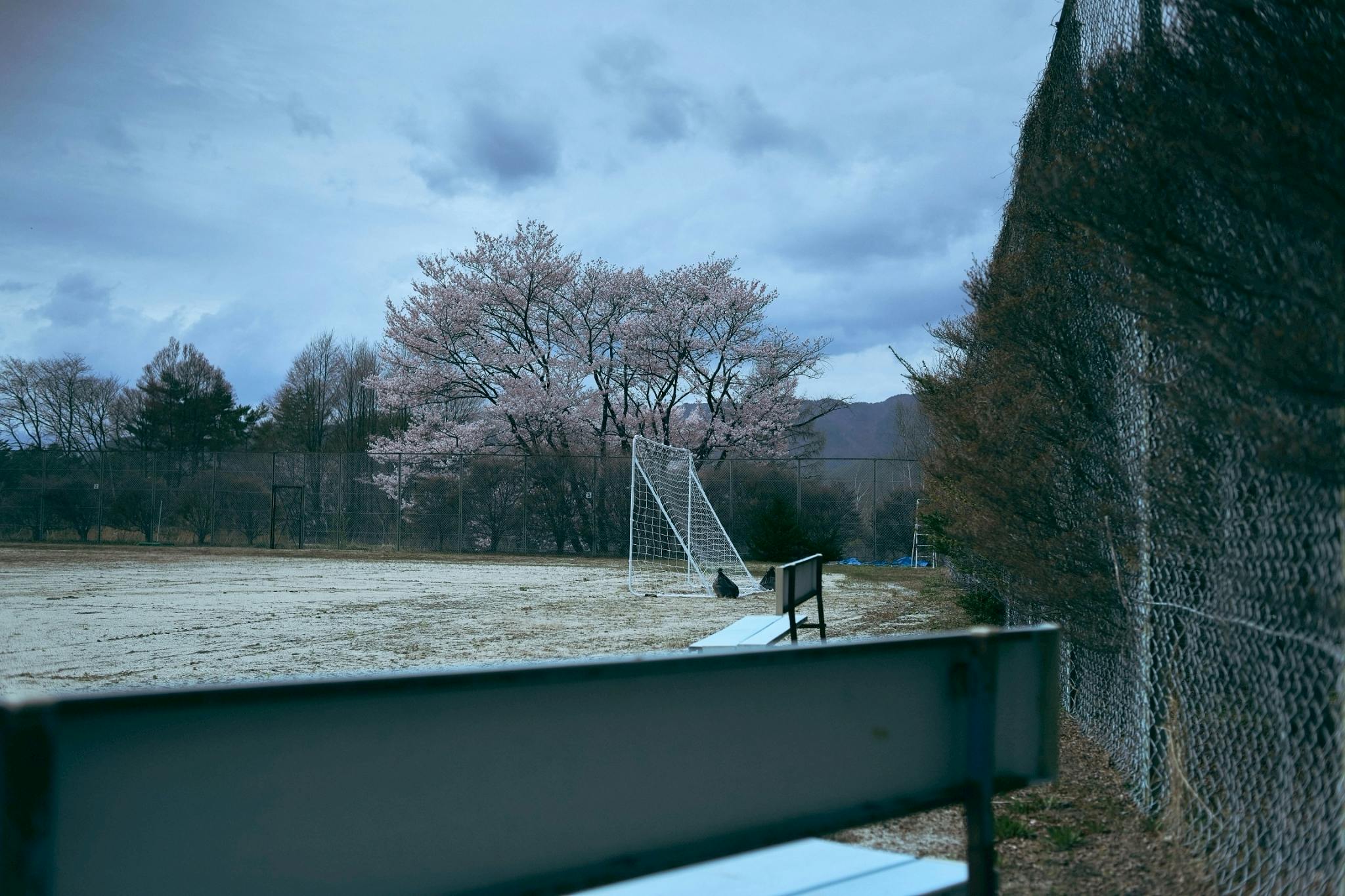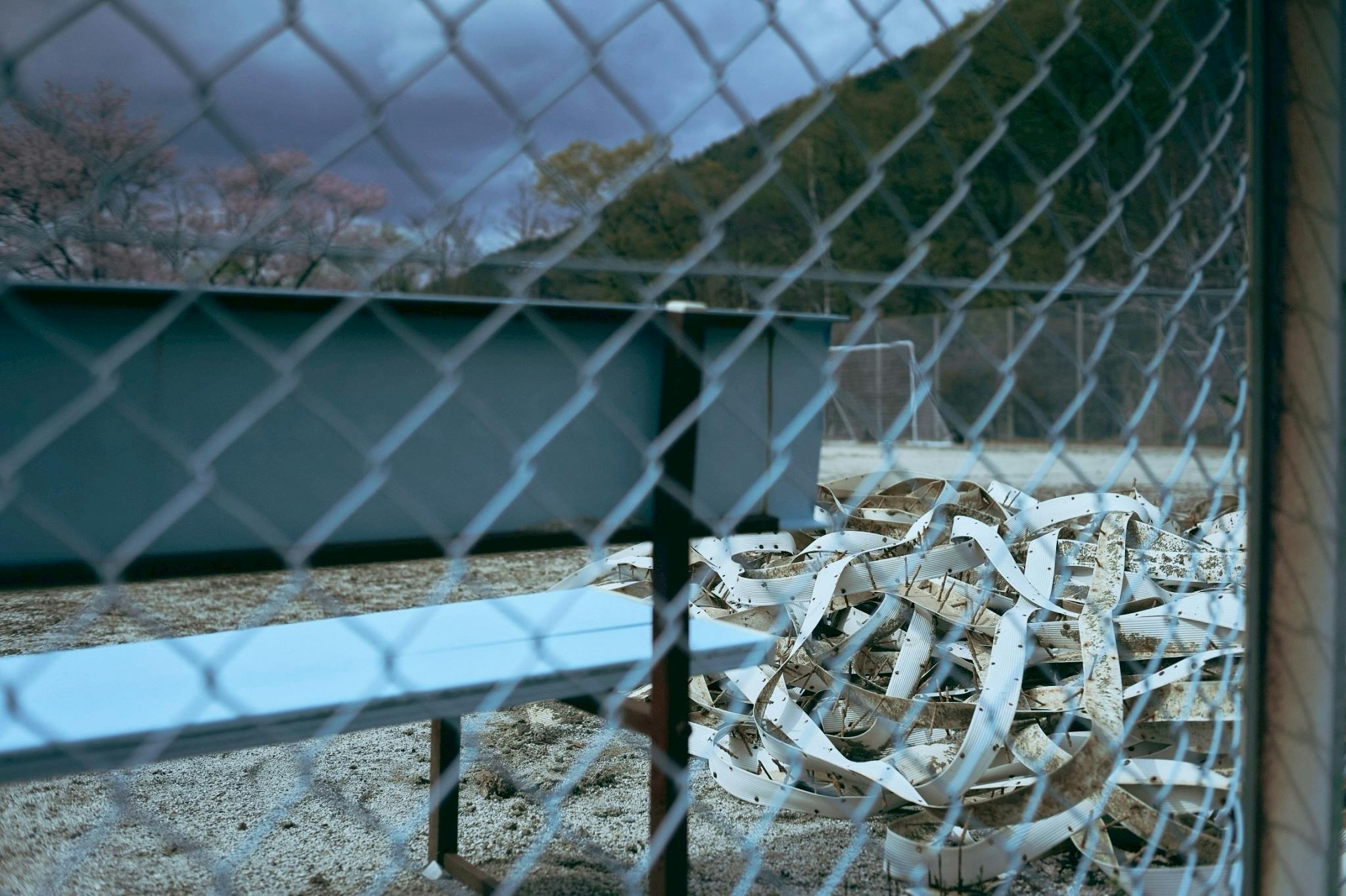 フェンスから突き出す枝は、長い年月の中で根付いた"生命の逞しさ"と、これまでの歩みを静かに物語っています。