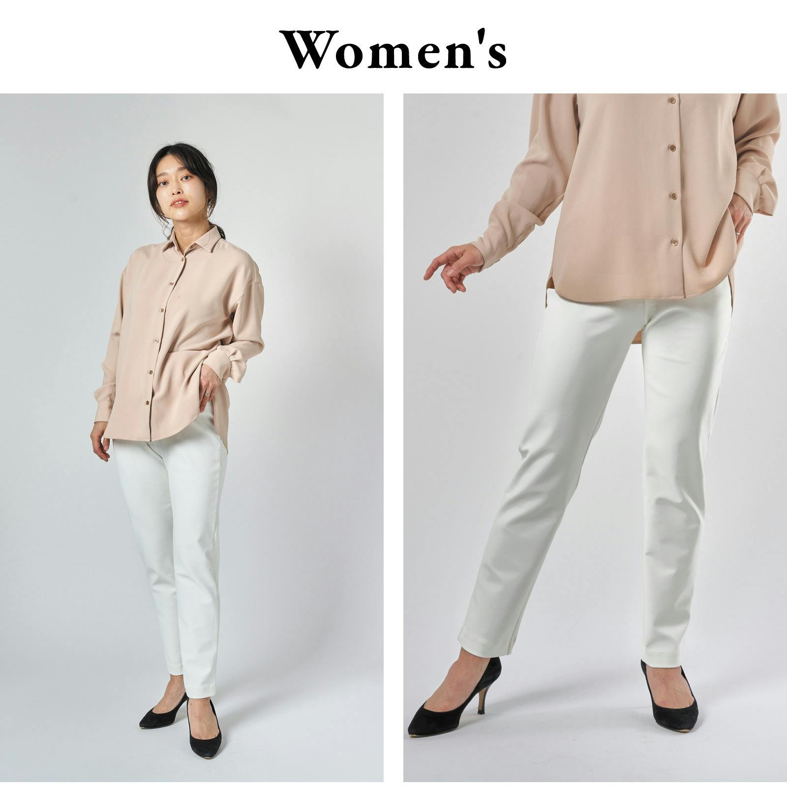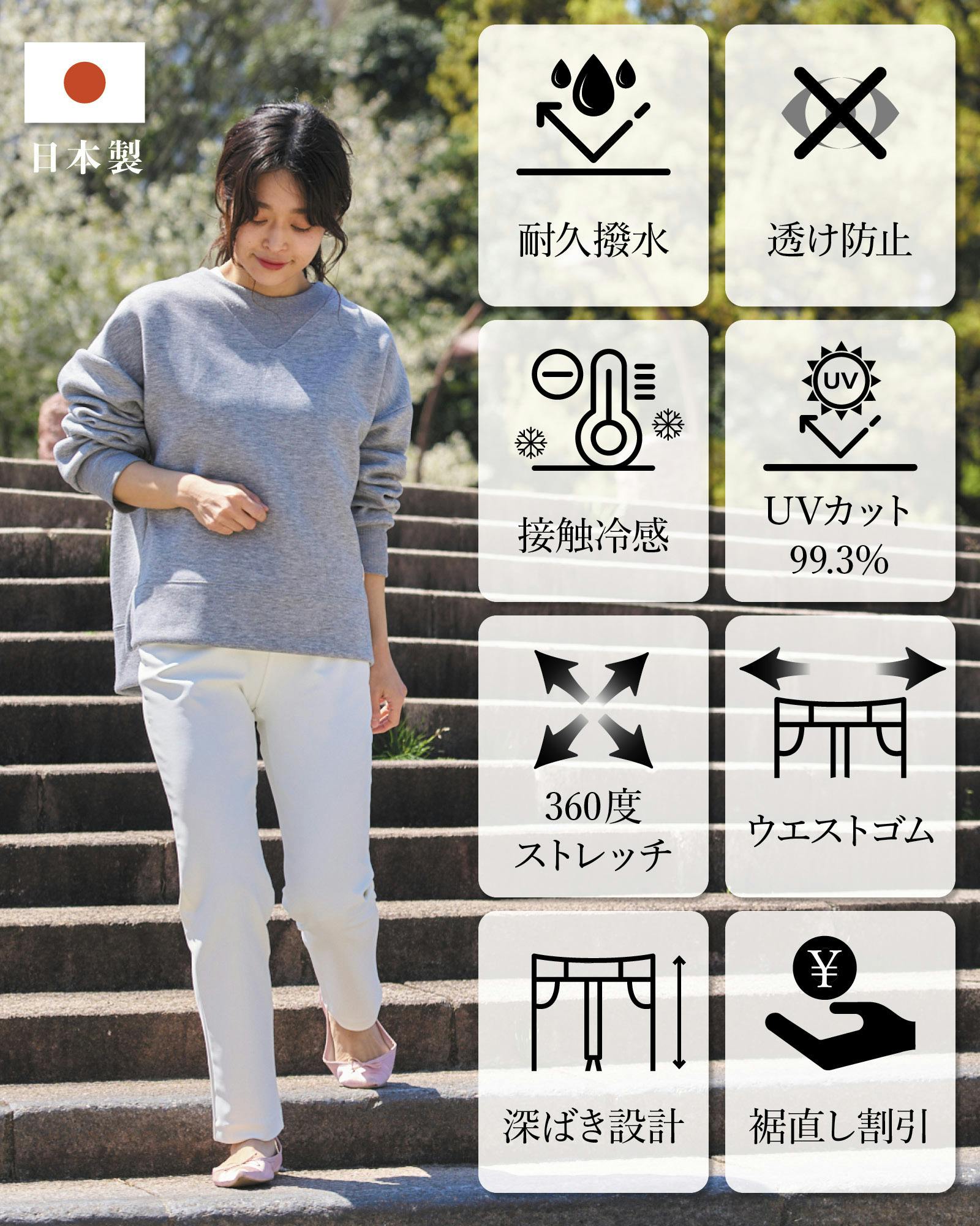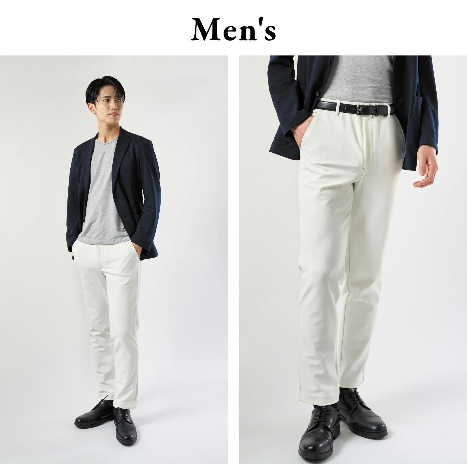 ホワイトパンツはさらっとした触り心地に加えて、「冷感指数(Q-max値)0.349J/㎠・sec」を誇る接触冷感と、遮熱性のある特殊繊維生地で、ひんやり爽やかな履き心地を実現。