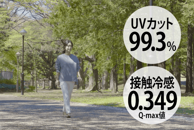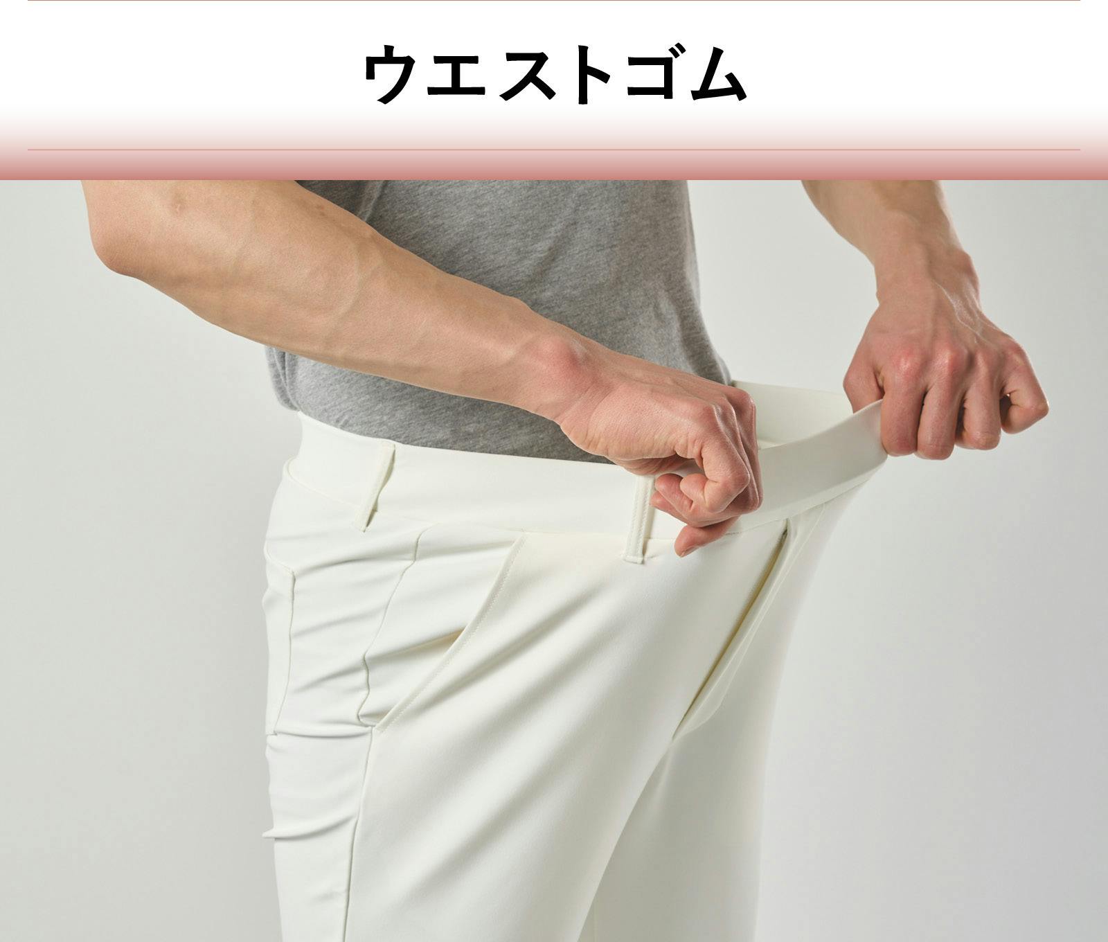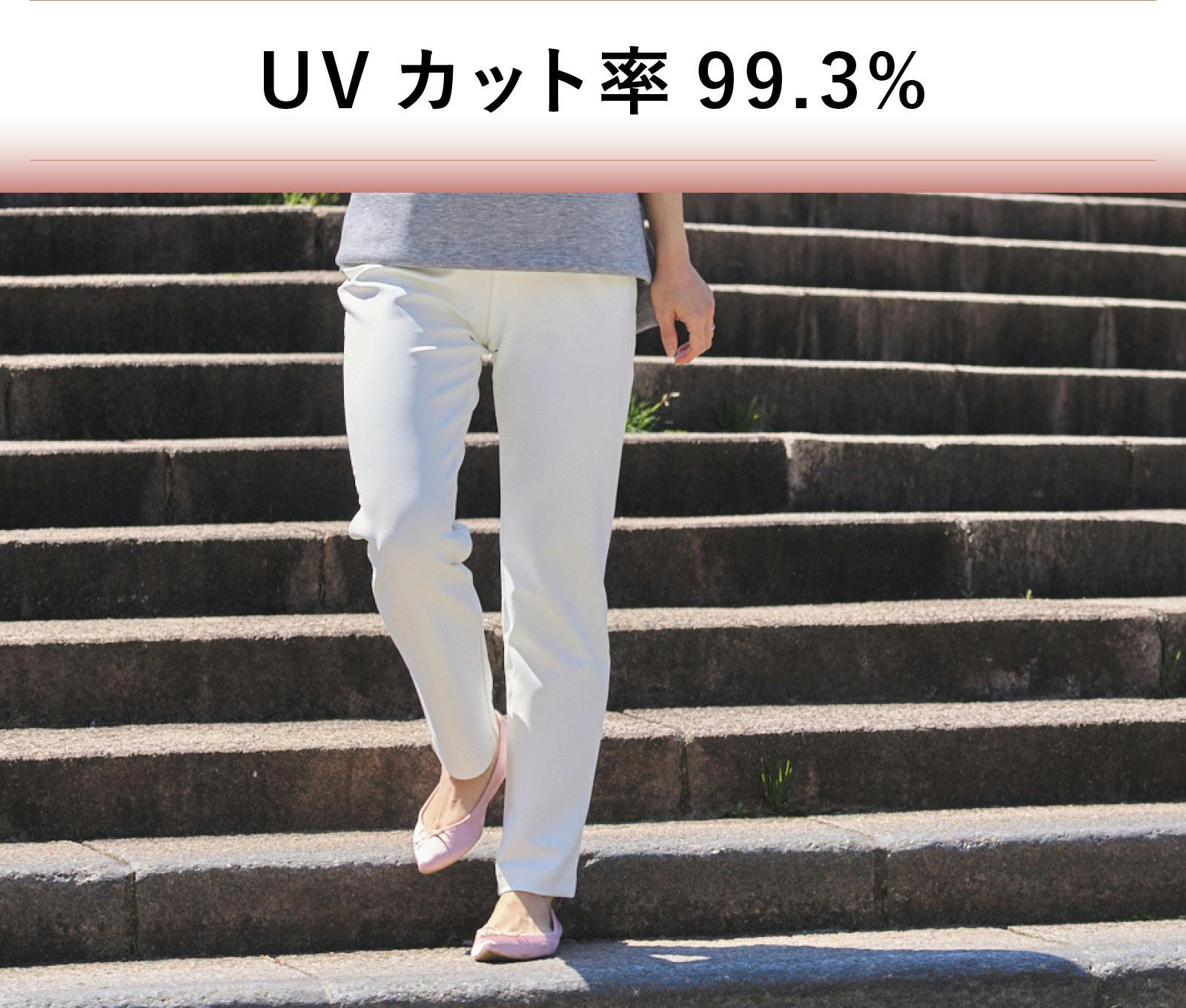 ホワイトパンツはさらっとした触り心地に加えて、「冷感指数(Q-max値)0.349J/㎠・sec」を誇る接触冷感と、遮熱性のある特殊繊維生地で、ひんやり爽やかな履き心地を実現。