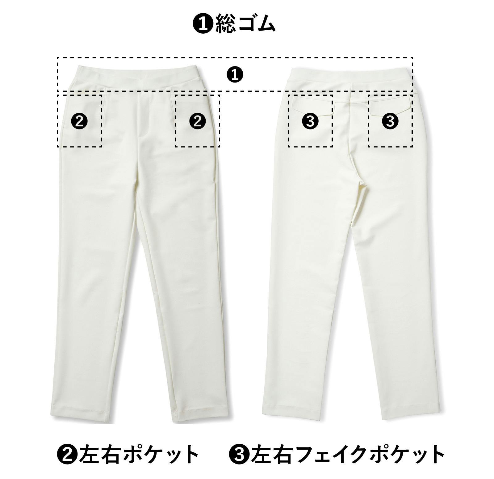 ベルトいらずで、いつでもどこでもラクに履くことができます。平ゴムだからシワが寄らないのも嬉しい!
