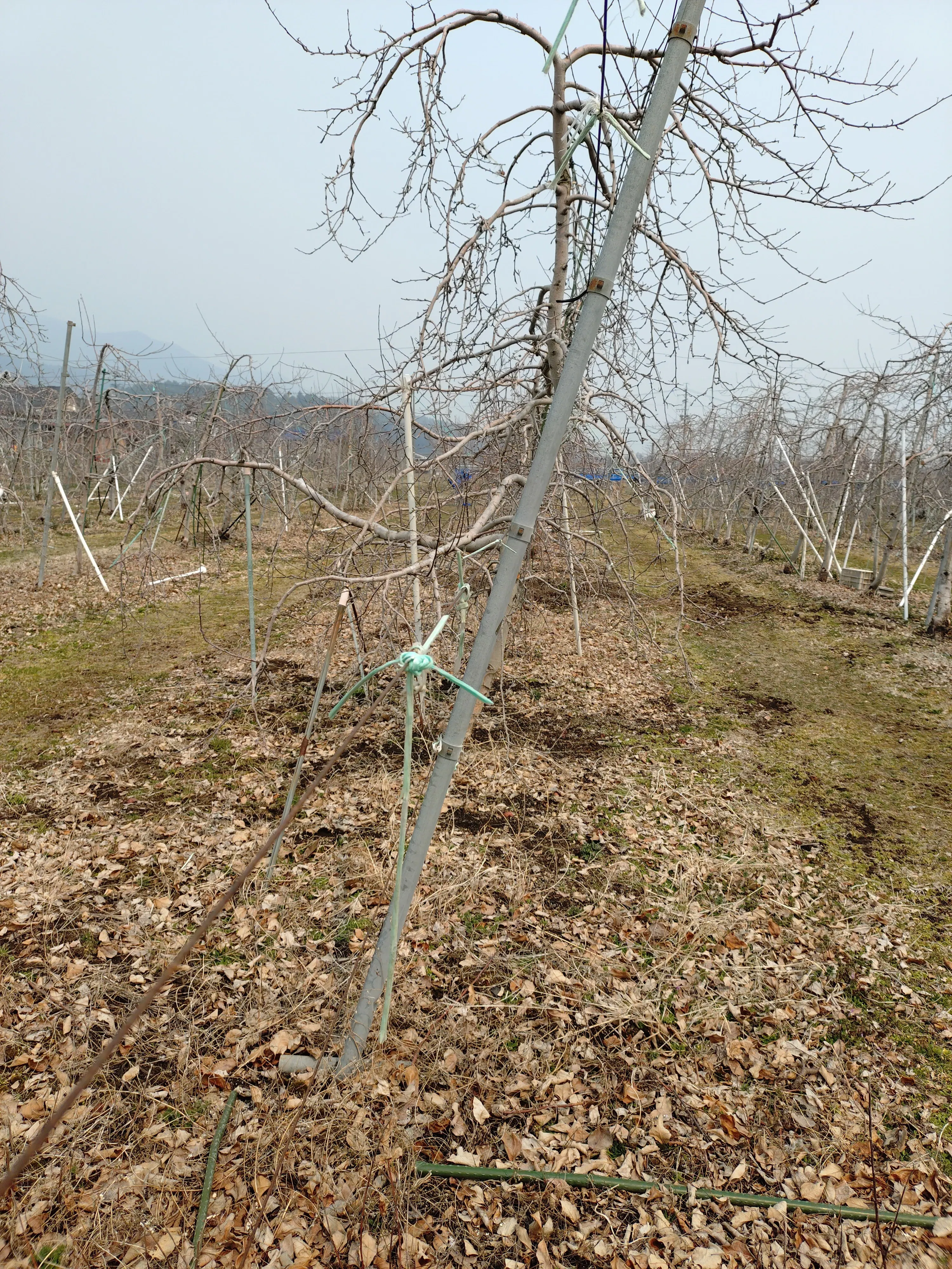 具体的には、支柱の購入費用です。抜けかかっているものは再度埋め直せばよいのですが、りんごの木の重みで途中から曲がってしまった支柱が園地全体で20本あります。支柱の購入額の見積もりが1本5,000円で20本で100,000円の計算になります。