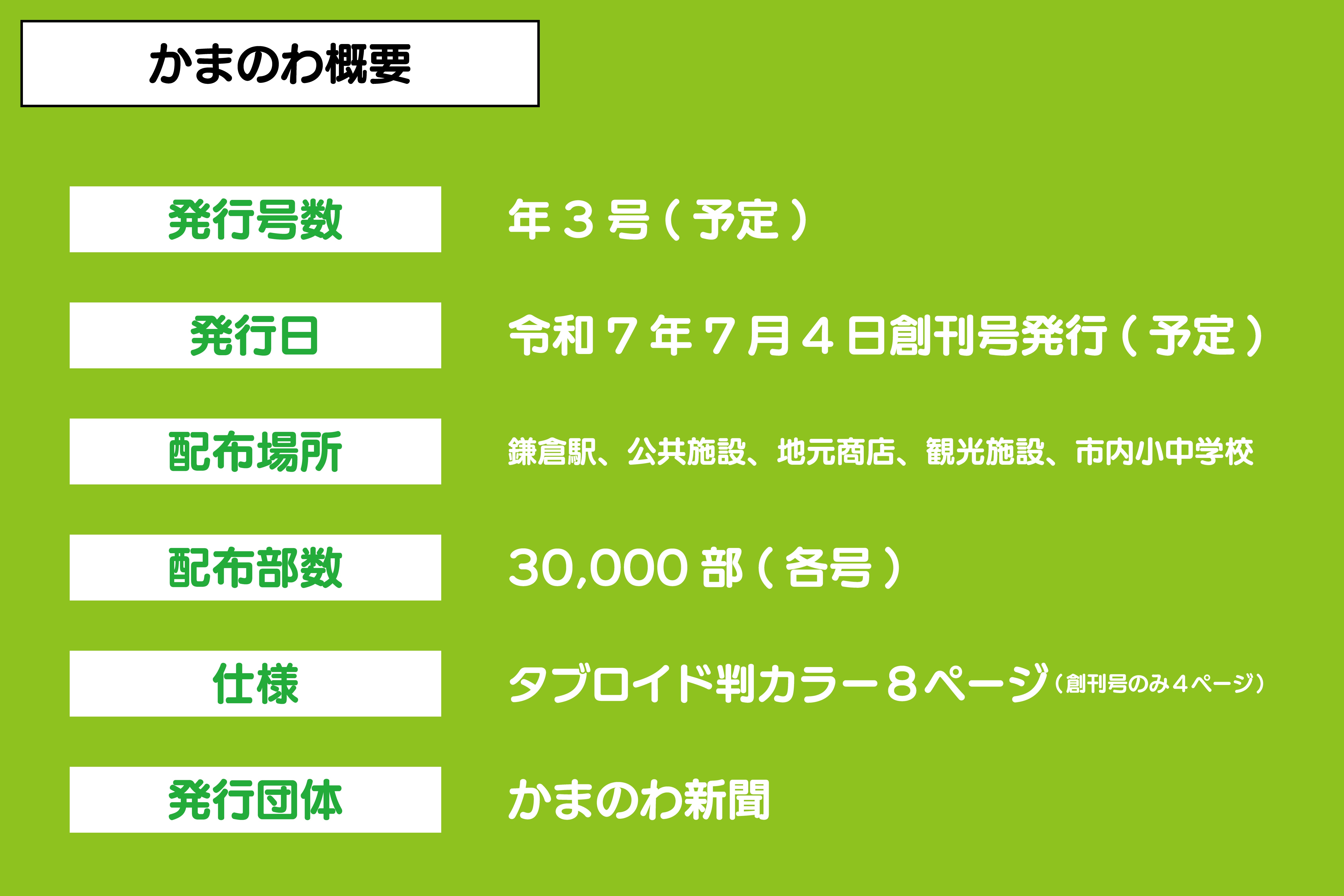 「かまのわ」とは、「鎌倉」+「輪(つながり)」で、人のつながりをイメージしています。若者が主体となり、取材、執筆、編集を行い鎌倉市民向けの情報を中心に掲載します。また地元ならではの視点で観光情報、イベント情報などを紹介していきます。