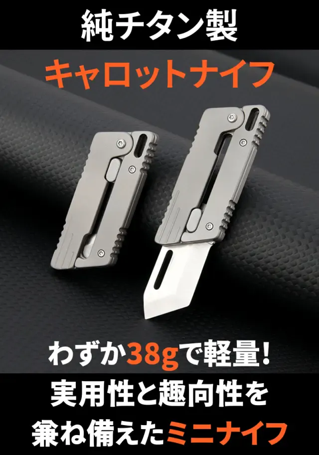 この純チタン製キャロットナイフは、大人の心を魅了するだけでなく、実用性も抜群です。日常のちょっとした作業やアウトドアシーンでも活躍します。