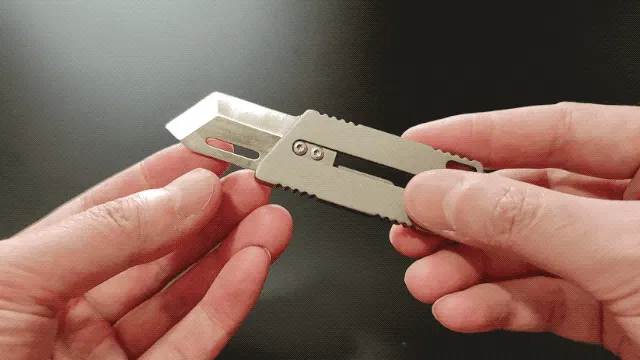 右のパーツを手で掴み、少し右側に開き、軽く振るか、下向きにして重力を利用することで刃を出すことができます。