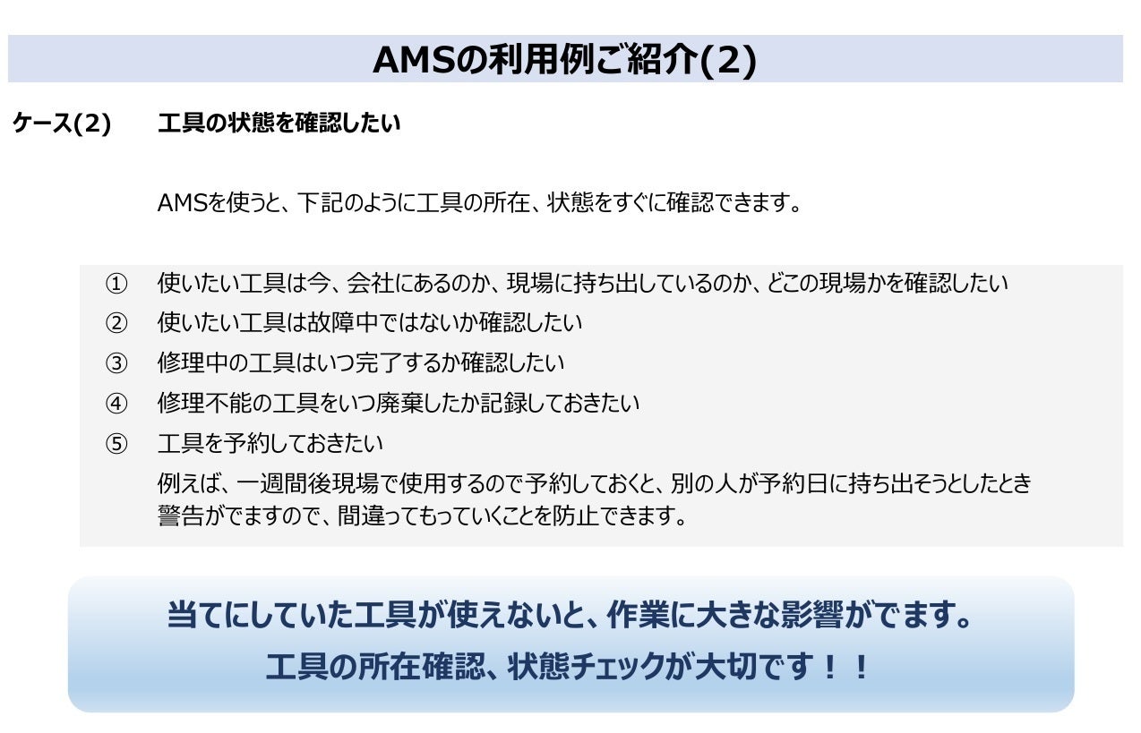 こんな困りごとは「あるある」ではないですか?当てにしていた工具が見つからないのでやむを得ず再購入 ・・・無駄な出費工具を、いざ使おうとしたら故障して使えない ・・・作業が進まず大ピンチ使う予定の工具を誰かが持って行ってしまった ・・・代替え工具を用意するのに時間がかかったAMSで解決です!!