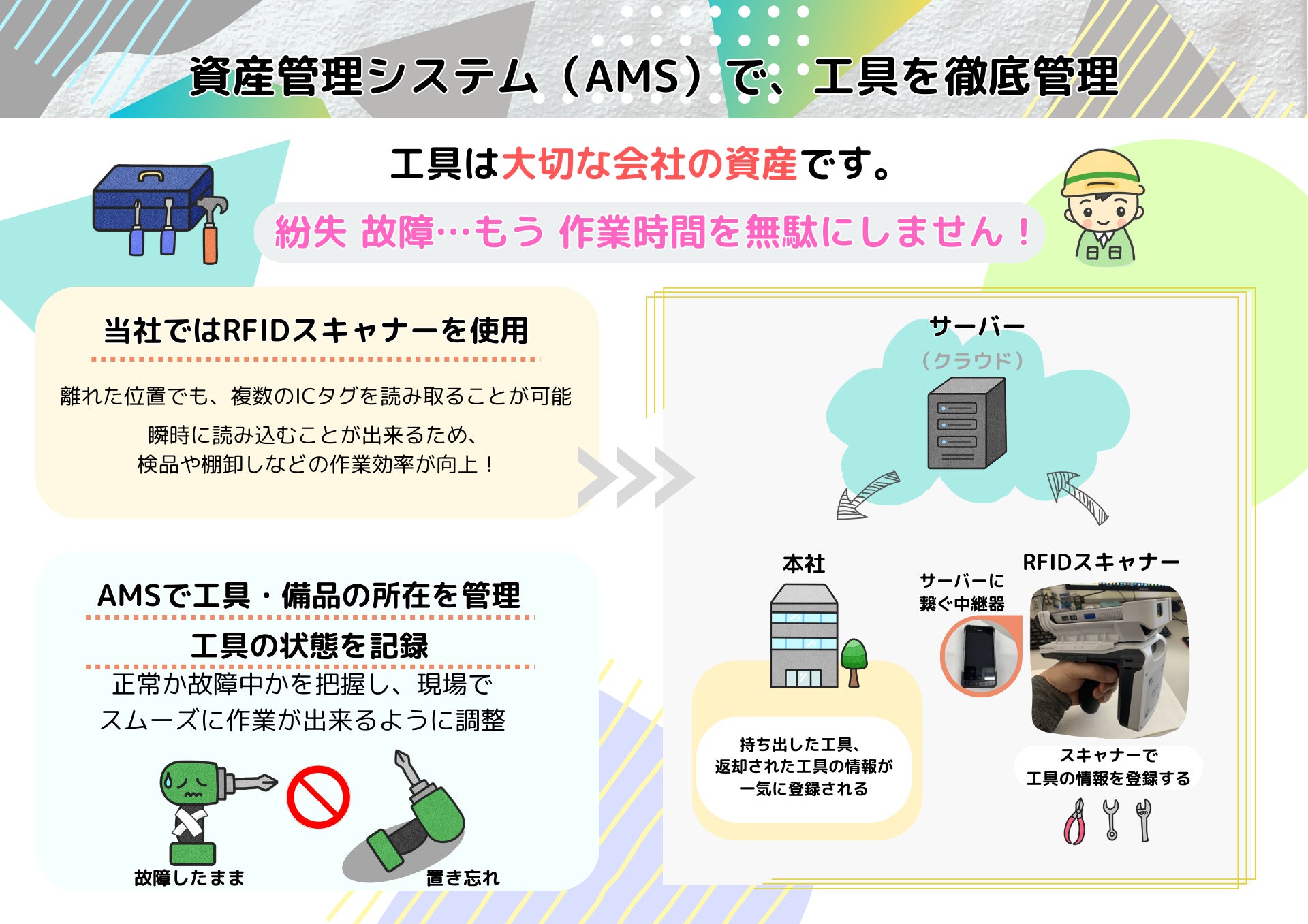 資産管理システム「AMS(Asset Management System)」は、工具や資材といった“モノ”の所在や状態を正確に把握し、効率的かつ確実な管理を実現するために開発された、現場向けの革新的なツールです。