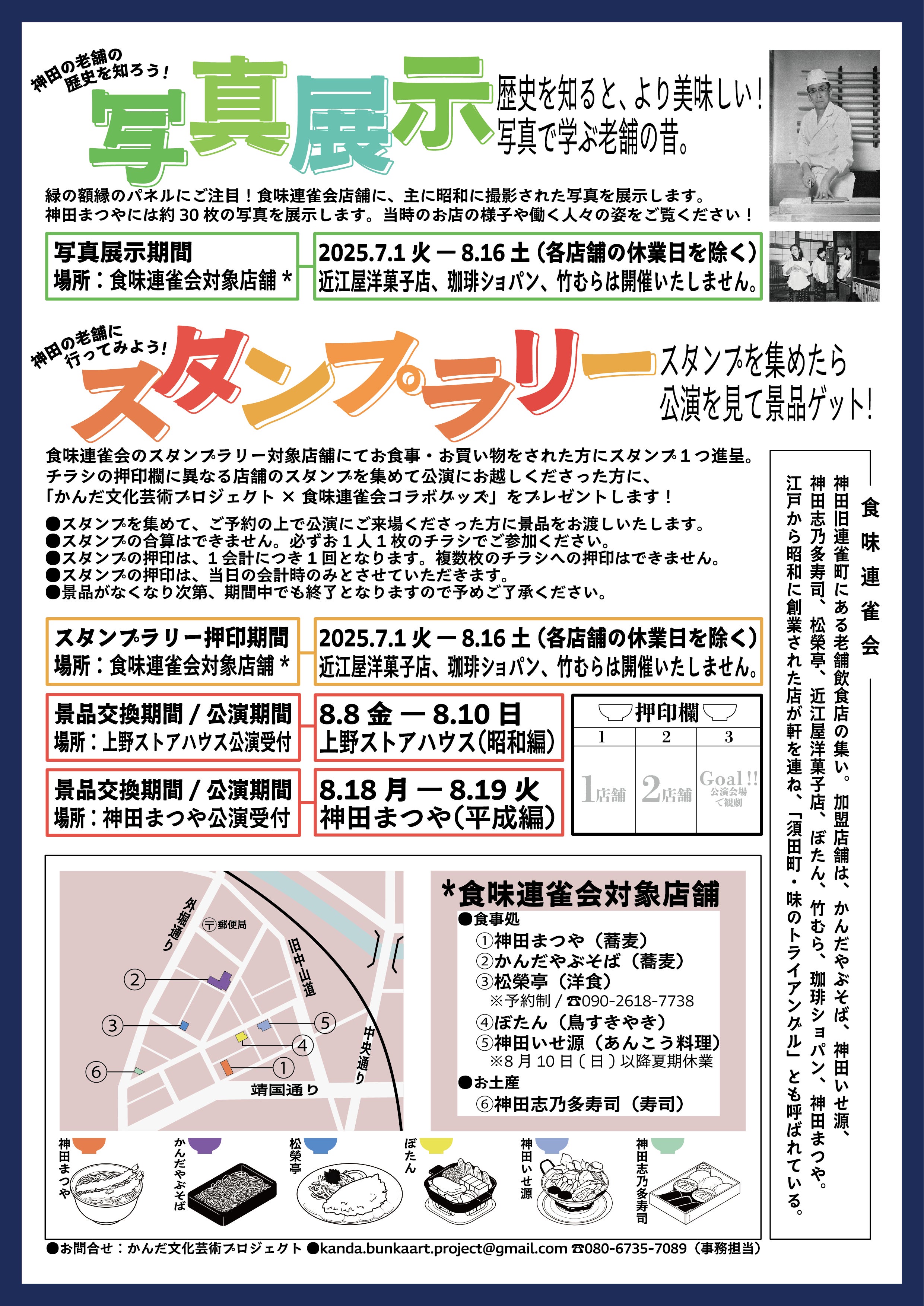 また、かんだ文化芸術プロジェクトは今回の公演に向けて、スタンプラリーや写真展示のイベントを開催します。私たちは、それらのイベントを一緒に盛り上げたい!そして食味連雀会店舗の魅力を発信するための一翼を担いたい!という思いから、イベント期間中に利用できるクラウドファンディング限定のリターンを用意いたしました。