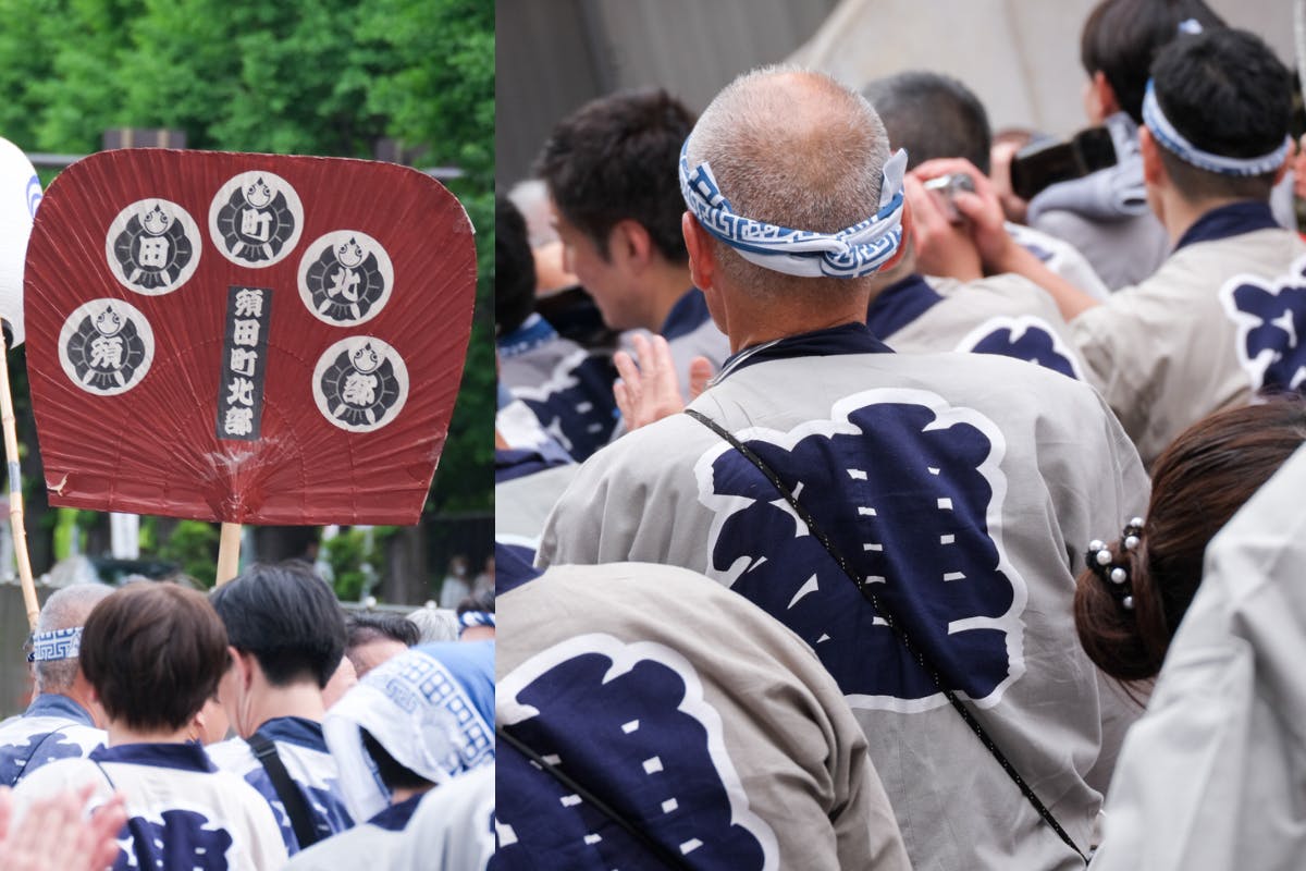 町会ごとに異なるはっぴを身につけているのですが、須田町北部町会のみなさんの背中には「連」の字!大きな団扇には「雀」のマーク。