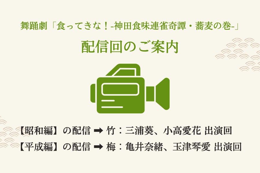 みなさん、こんにちは!studio ALMAです!本プロジェクトページをご覧いただきありがとうございます!公演の配信チケットを含むリターンについて、補足のご案内です。※対象リターン※・食味連雀会で使えるお食事券(6,000円分)と【昭和編】公演チケットのセット・食味連雀会で使えるお食事券(11,000円分)と【昭和編】公演チケットのセット・神田いせ源の「鮟まん」と【昭和編】公演チケットのセット・近江屋洋菓子店の「フルーツポンチ」と【昭和編】公演チケットのセット・神田まつやの「八割そば(乾麺)」と【昭和編】公演チケットのセット・そば灯スポンサーになる・【VIP】スポンサーになる上記のリターンには、舞踊劇「食ってきな!-神田食味連雀奇譚・蕎麦の巻-」の公演チケットが含まれています。公演チケットをお選びいただくと、「劇場で観劇」または「配信」のどちらかを選択できます。今回の公演は一部ダブルキャストになっており、配信は片方のキャストの組のみで行うこととなりました。配信する組は以下の通りです。【昭和編】の配信 ➡竹:三浦葵、小高愛花 出演回【平成編】の配信 ➡梅:亀井奈緒、玉津琴愛 出演回配信チケットをお選びになる際は、出演キャストはお選びいただけませんこと、あらかじめご了承ください。引き続き、応援のほどよろしくお願いいたします!