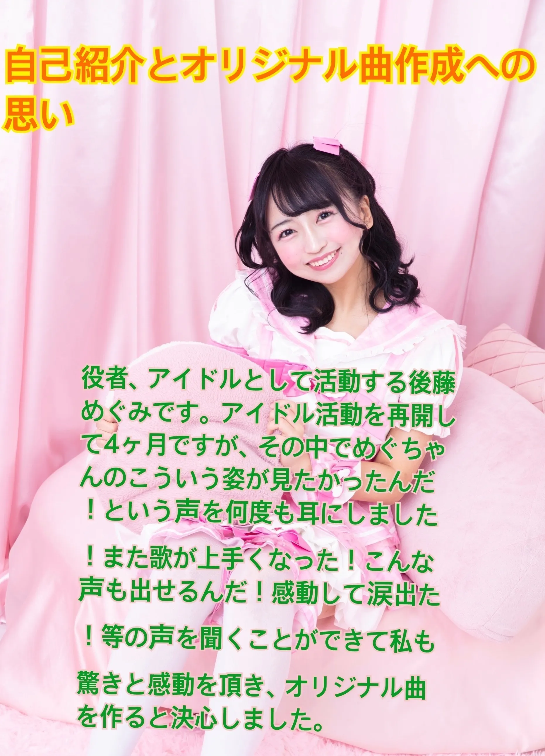 後藤めぐみと申します。アイドル歌手として活動を始め、4ヶ月が経ちました。これまで多くのステージで歌ってきた中で、ファンの皆様からの温かい応援を受け、深い感謝の気持ちを抱いています。私の音楽を通じて、多くの方に笑顔と感動を届けたいという願いを持っています。