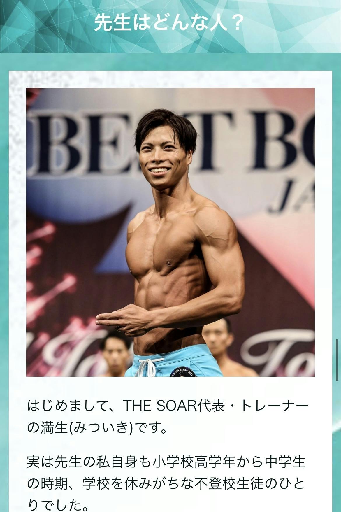 パーソナルトレーニングスクール「THE SOAR(ザソア)西新」の代表兼トレーナー、満生(みついき)翔一と申します。