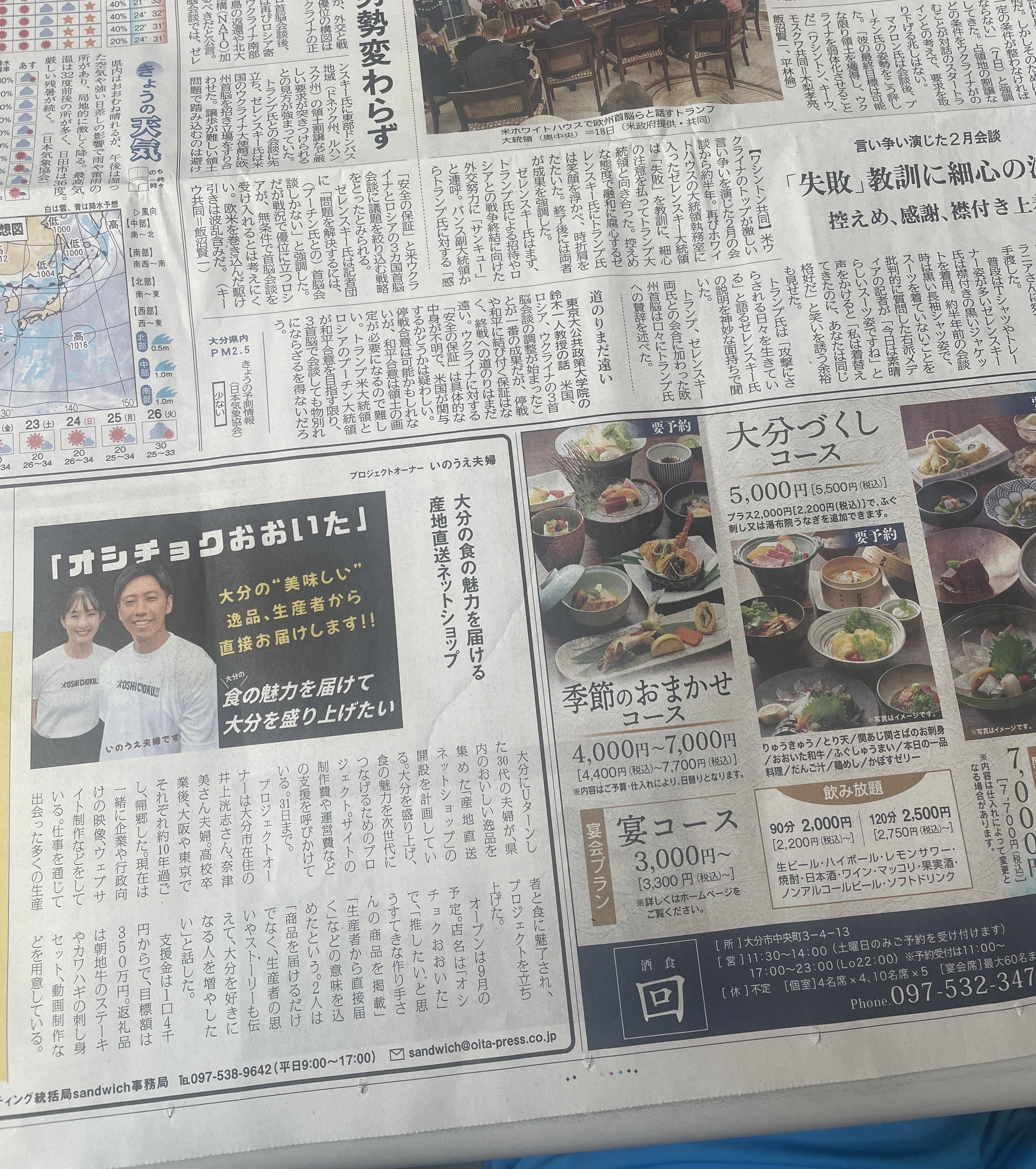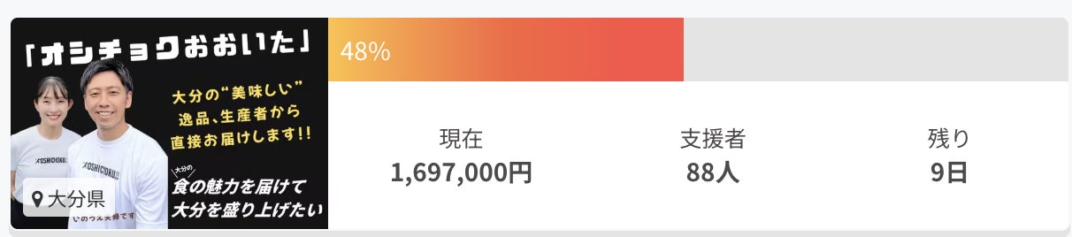 クラウドファンディングも残り5日!!一緒に大分を盛り上げてくれる企業様・個人様募集しています!!「オシチョクおおいた」をスポンサーとして支えてくださる企業様、個人様を募集しています!!一緒に大分を盛り上げていきましょう!!よろしくお願いします!!【スポンサープラン】<ゴールドスポンサー>クラファン支援額 300,000円残り枠 1/2紹介動画を制作させていただき1年間私たちのインスタグラムのトップに固定させていただきます。その他キャプション等にお名前を随時入れさせていただきます!!<シルバースポンサー>クラファン支援額 200,000円残り枠 3/3私たちが普段活動の時に着用しているオシチョクTシャツの背中部分に企業名やご希望のロゴ等をプリントさせていただきます!!あなたの企業、ロゴを背負って一緒に大分を盛り上げていきます!!<ブロンズスポンサー>クラファン支援額 100,000円残り枠 3/4私たちが普段活動の時に着用しているオシチョクTシャツの袖部分に企業名やご希望のロゴ等をプリントさせていただきます!!クラウドファンディング進捗状況支援金額1,864,000円残り1,636,000円ご支援はプロフィールのリンクよりお願いします!!