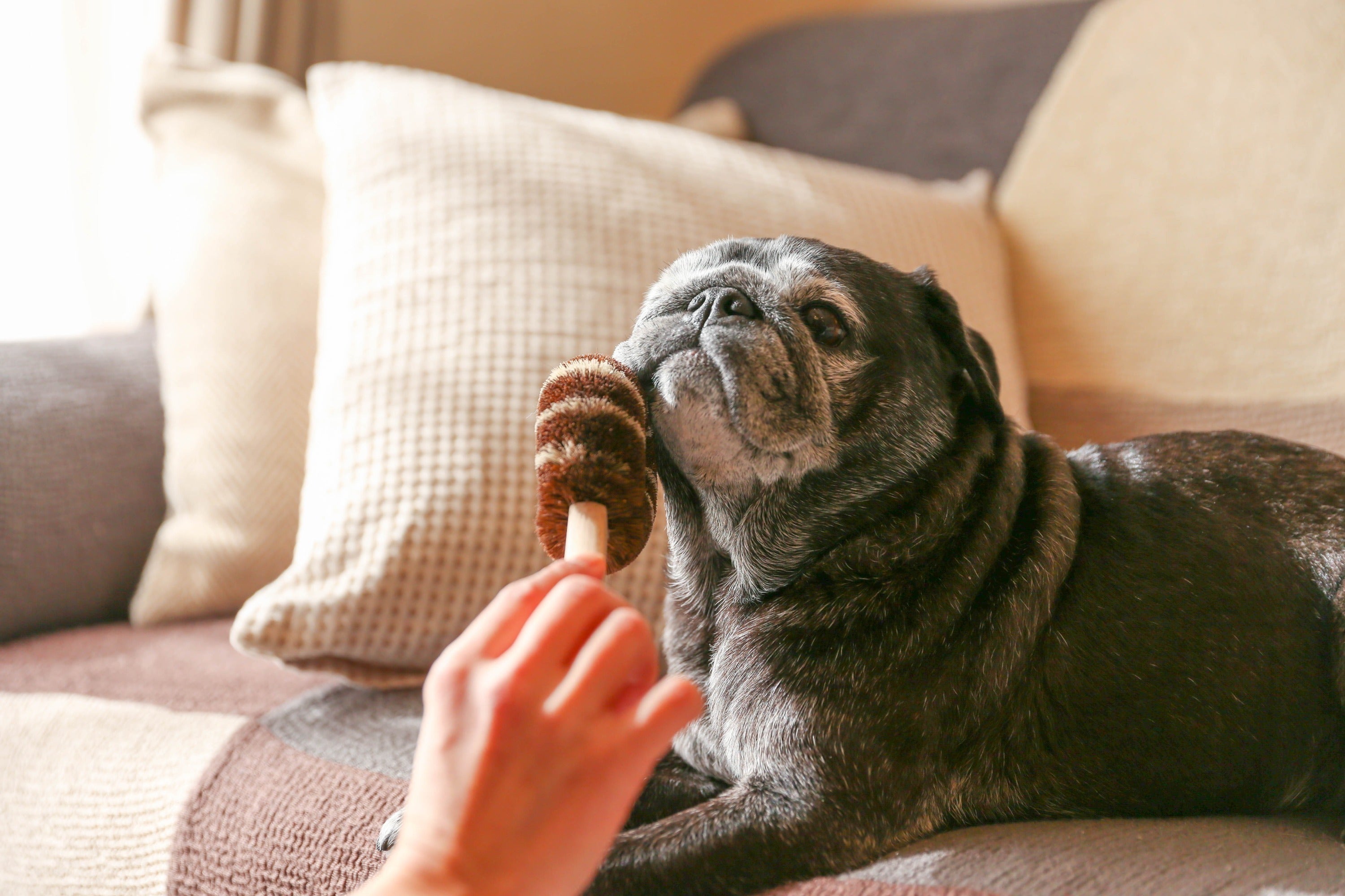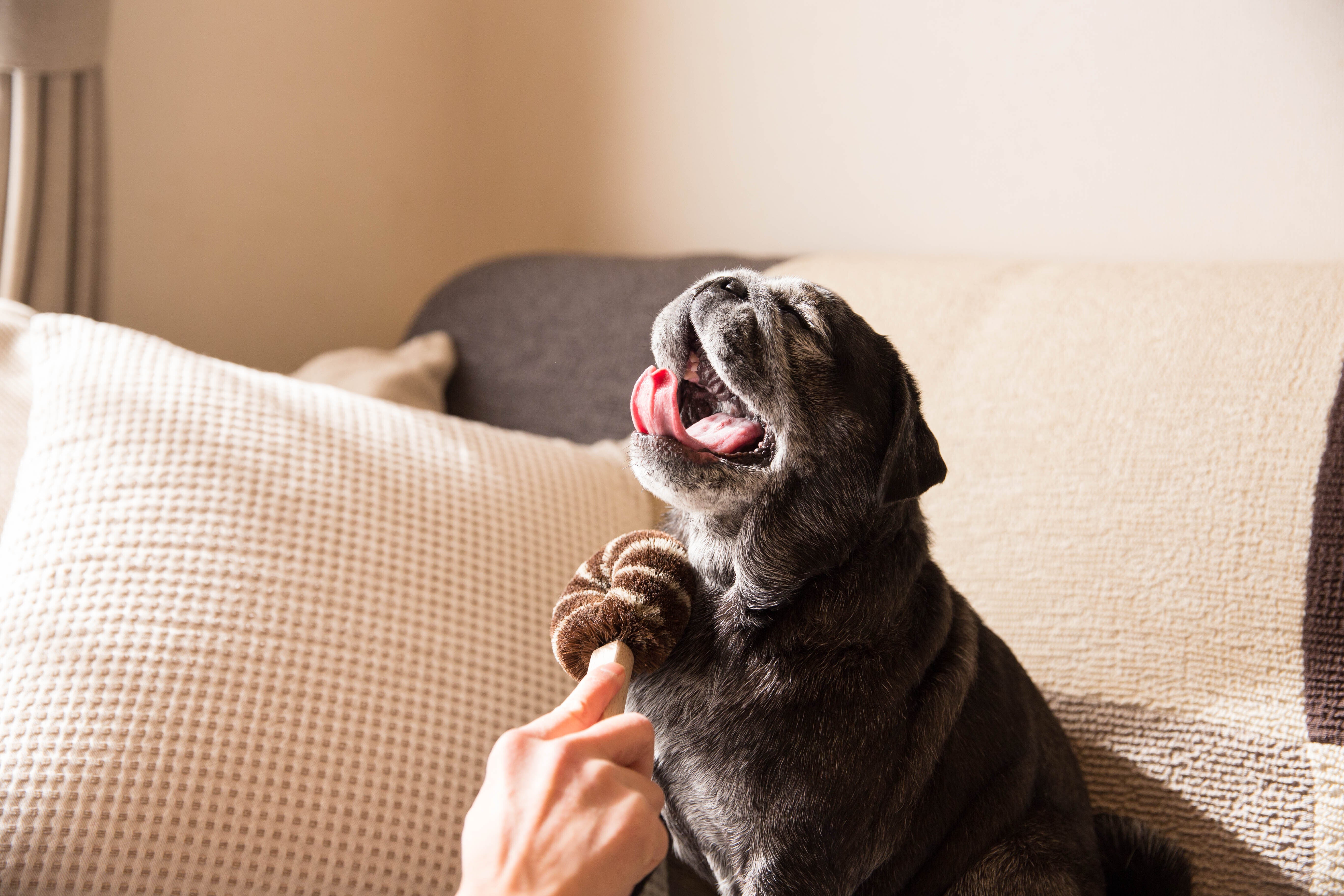 ブラッシング中の気持ちよさそうな表情と、艶やかな毛並みを見て、このたわしをペット専用に改良できるのではないかと思い立ちました。