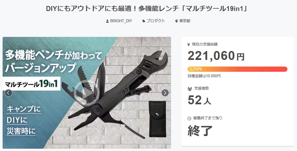 2025/10/02 00:45ご支援者様、DIYにもアウトドアにも最適!多機能レンチ「マルチツール19in1」にご興味をお持ちいただきありがとうございます。プロジェクト開始から54日目で52人ものご支援者の方々より支援頂き、無事プロジェクト終了を迎えることが出来ました。早速皆様のリターンを2025年11月末にお届けできるよう準備を始めております!皆様にご満足いただけるリターンをお届けできるよう、全力で取り組んで参りますので引き続き、「DIYにもアウトドアにも最適!多機能レンチ「マルチツール19in1」」をよろしくお願い致します。BRIGHTチーム もっと見る
