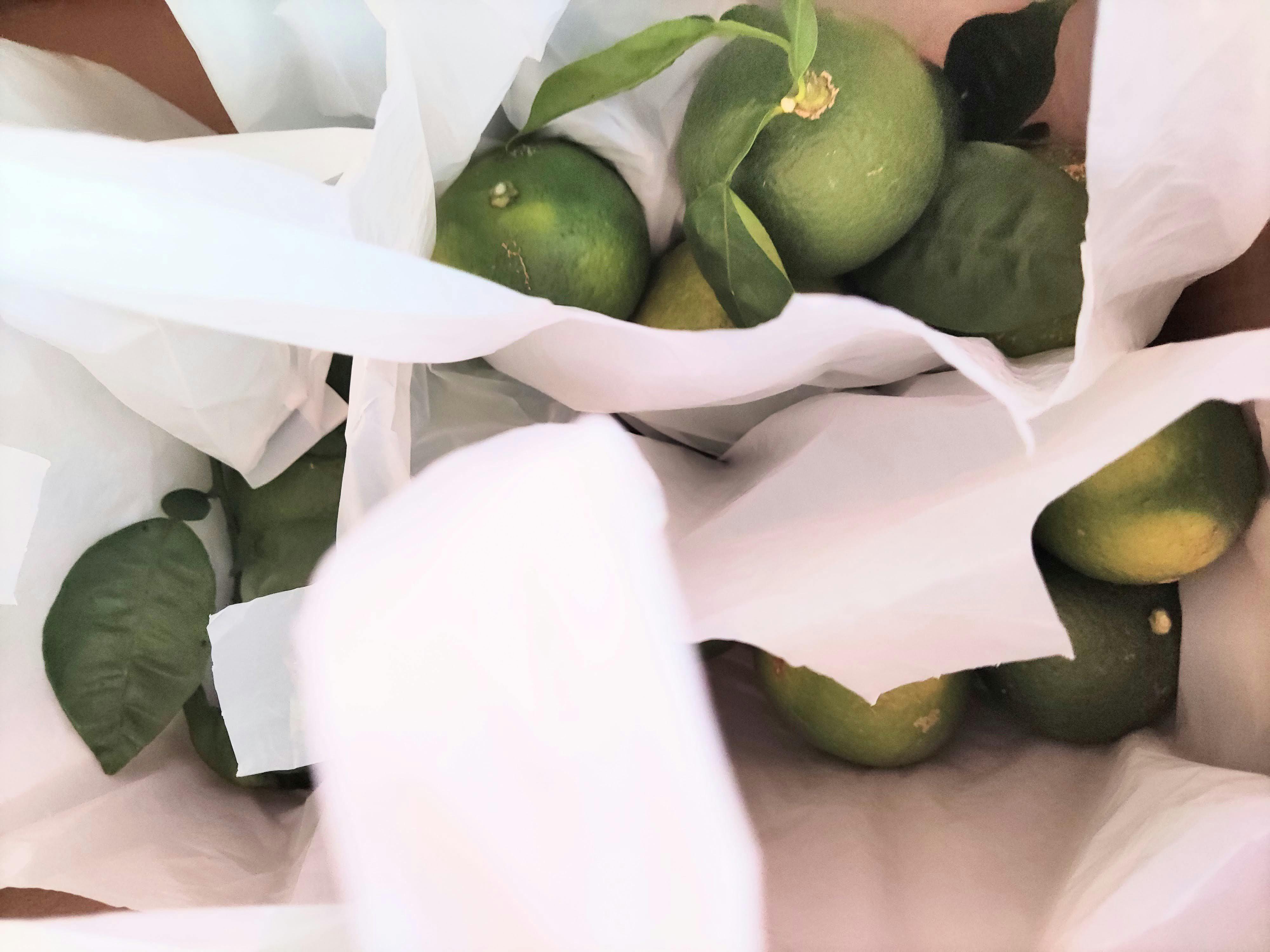 鮮度が伝わるように、あえて葉っぱがついたカボスも入れてからお配りしています。