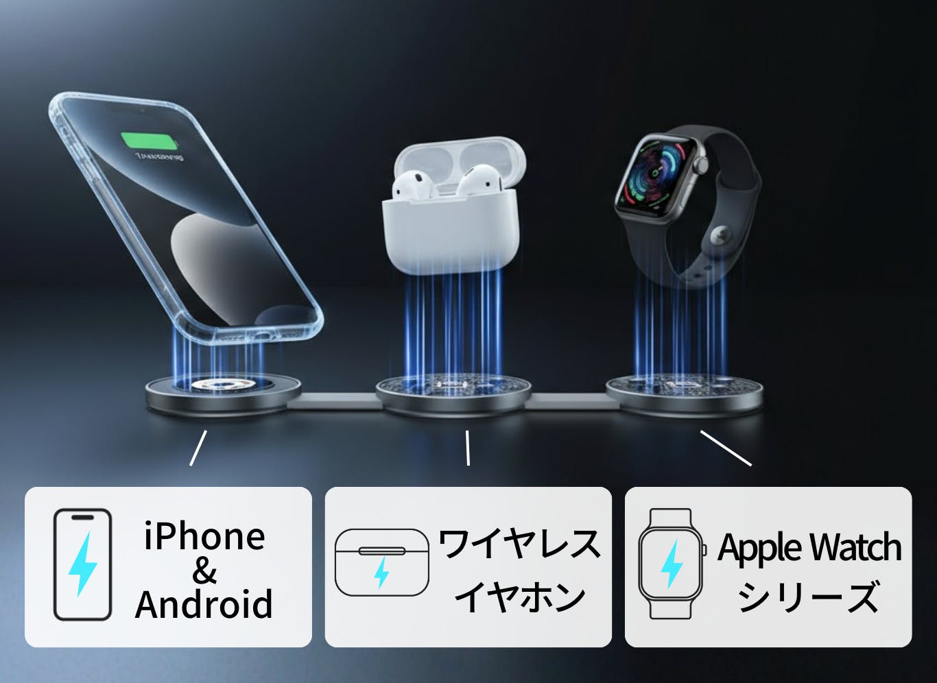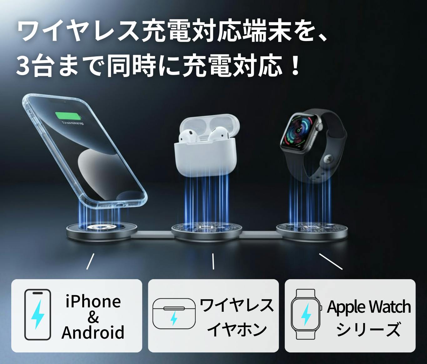 ワイヤレス充電対応端末を3台まで同時に充電!