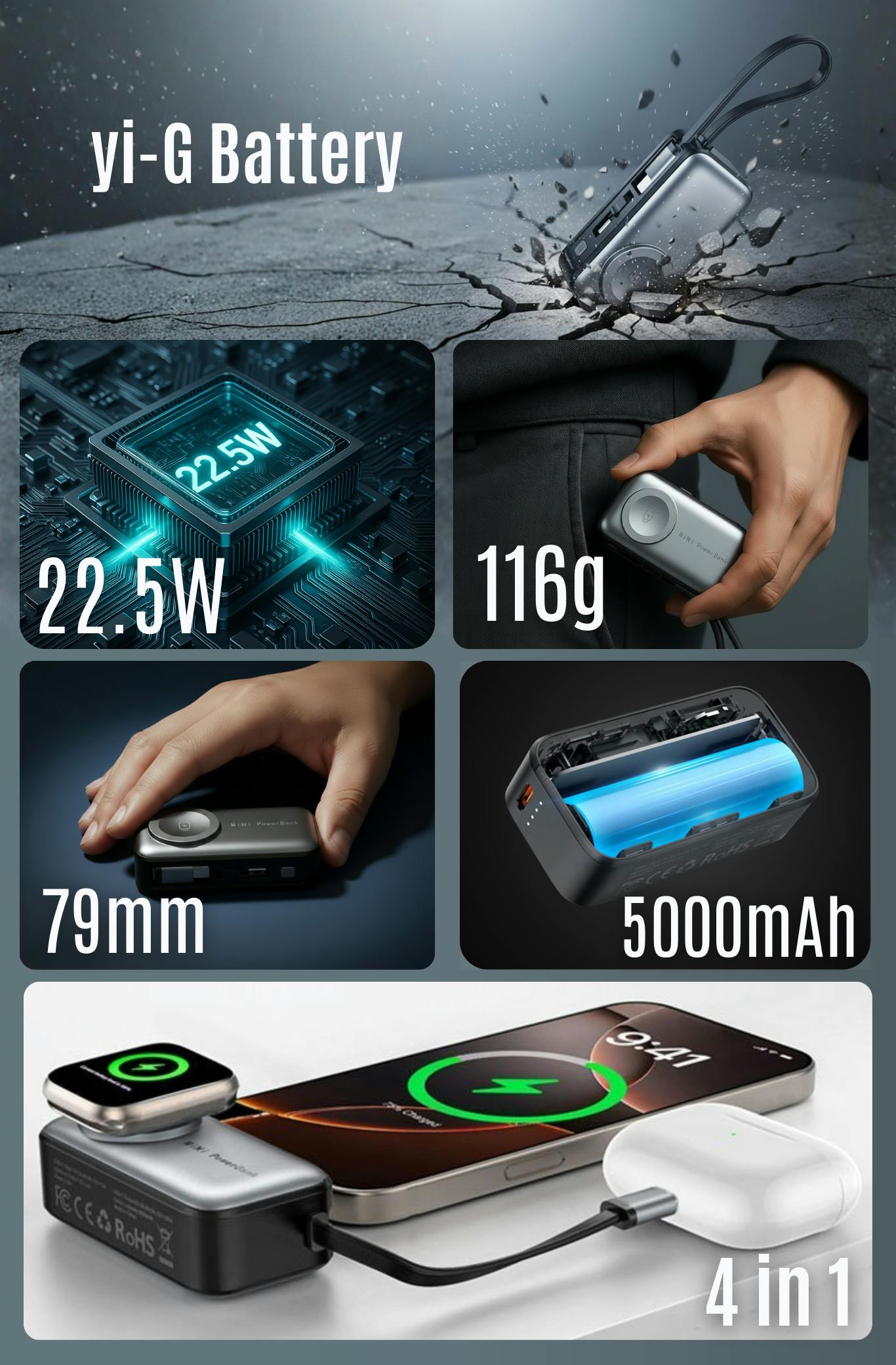yi-G Batteryは、新次元の直挿しモバイルバッテリー。1台に充電ポート・ワイヤレス・2種の端子を搭載した最大4台同時充電対応モデル。ポケットサイズでありながら、5,000mAhの大容量バッテリーとタブレット充電対応出力を詰め込んだ充電器です。