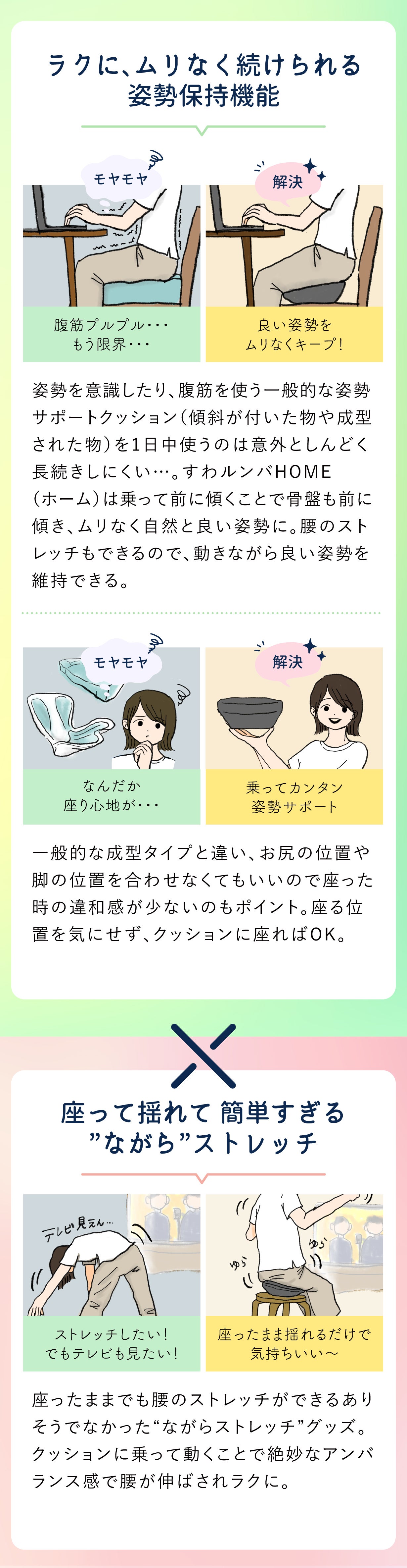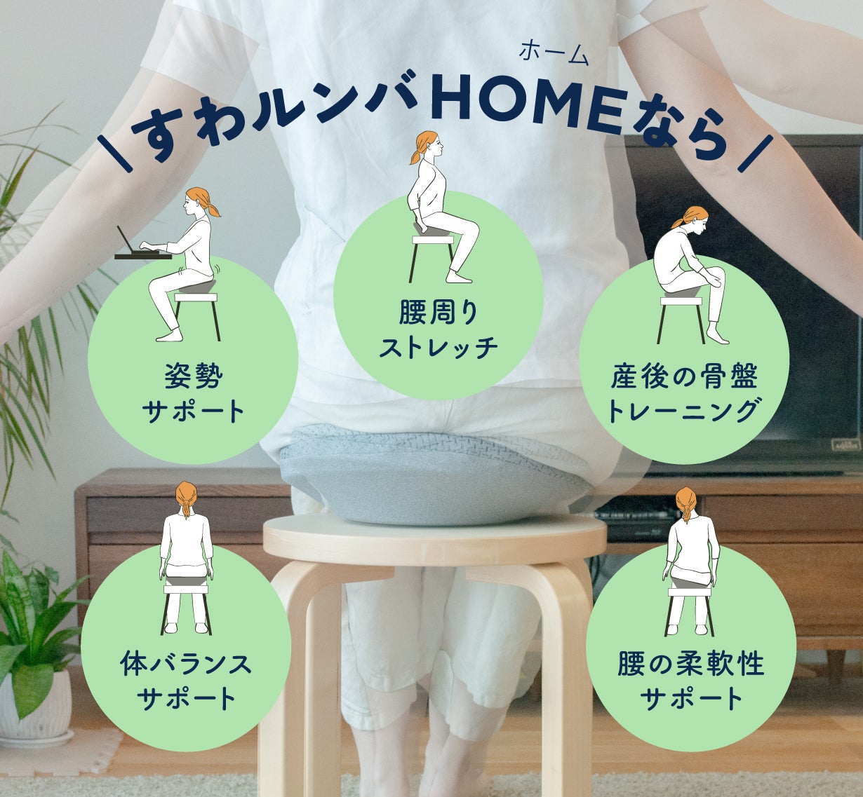 すわルンバHOME(ホーム)は座ったまま手軽に・効率よくストレッチ。ストレッチを続けることで腰への負担を軽減するので日常生活・仕事・スポーツなどによる腰のトラブルでお悩みの方におすすめ。