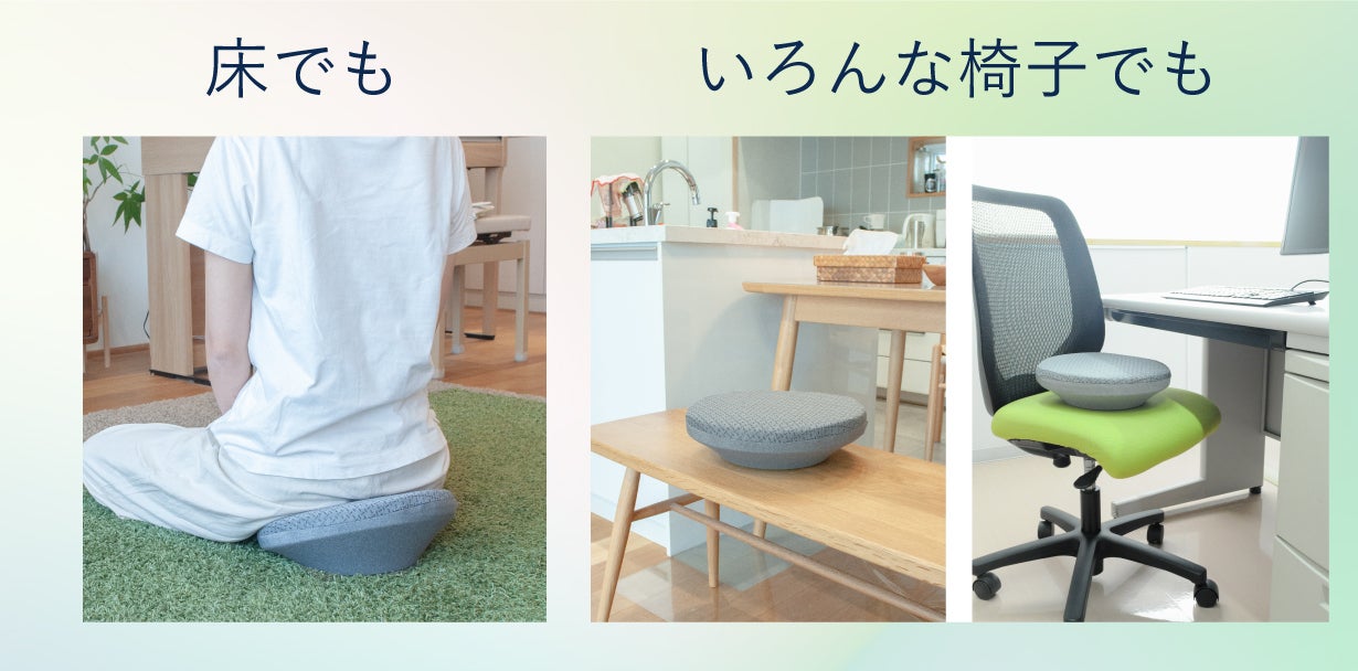 20°の絶妙な傾きが骨盤を前傾させるので、乗ることで良い姿勢が自然と作られる構造。床に座った時でも、クッションの傾斜により骨盤を立たせ、ムリなく良い姿勢を続けられます。
