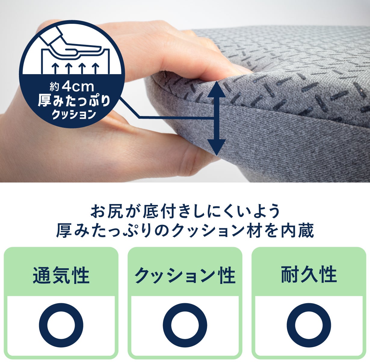 厚さ4cmの圧縮チップウレタンを内蔵。長期間座ってもへたりにくい。