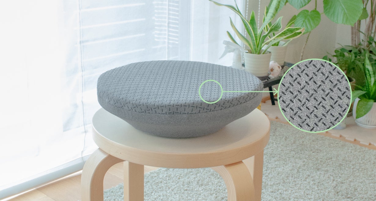 座面にはシリコンの滑り止めをプリント。傾いてもお尻がズレにくく、安定感があります。ペットや赤ちゃんが舐めても大丈夫なシリコン素材を採用しました。