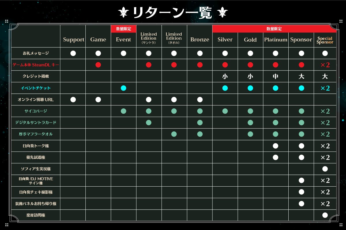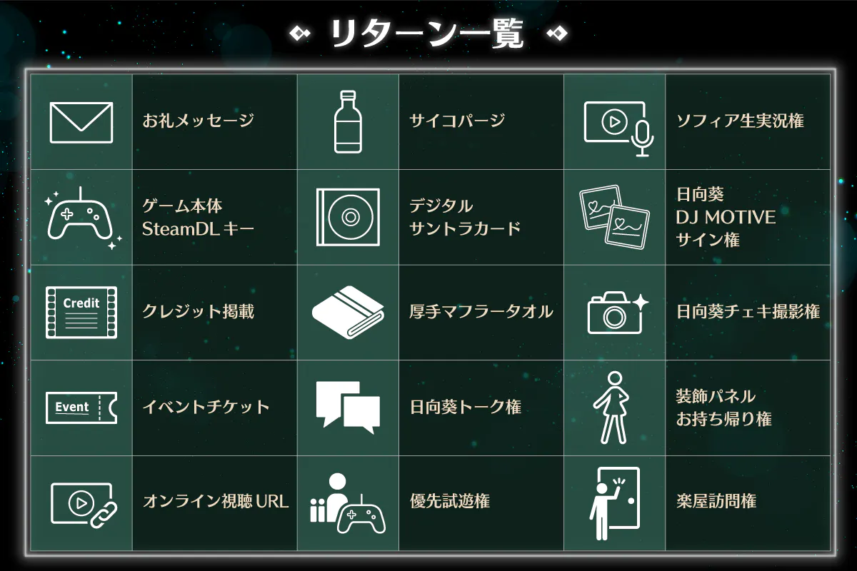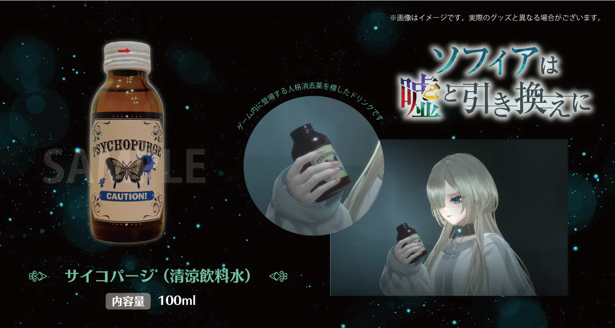 デジタルサウンドトラックと完全受注生産のオリジナルフルカラーマフラータオル、ゲーム内に登場する人格消去薬「サイコパージ」を模したドリンクを制作します。