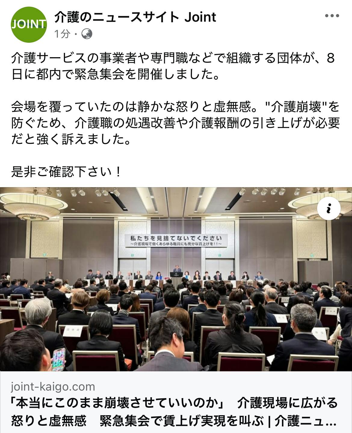 介護事業に関係する団体が緊急集会を行いました。そのくらい危機的な状況なんです。しかし、そのことは報道されない。数か月前には、医療職・介護職はストライキをしました。それも報道されませんでした。本当に介護サービスが不足してしまう。現場の人たちは、それに気づいている。何とかしようと、国に対してもアピールをして訴えている。でも、それが扱われることがないので、知られることがない。介護が必要になった時には、介護保険のサービスを受けられない。そんな状況を危惧して、わたしはクラウドファンディングを活用して、新たなセーフティネットをつくりたいと思っています。