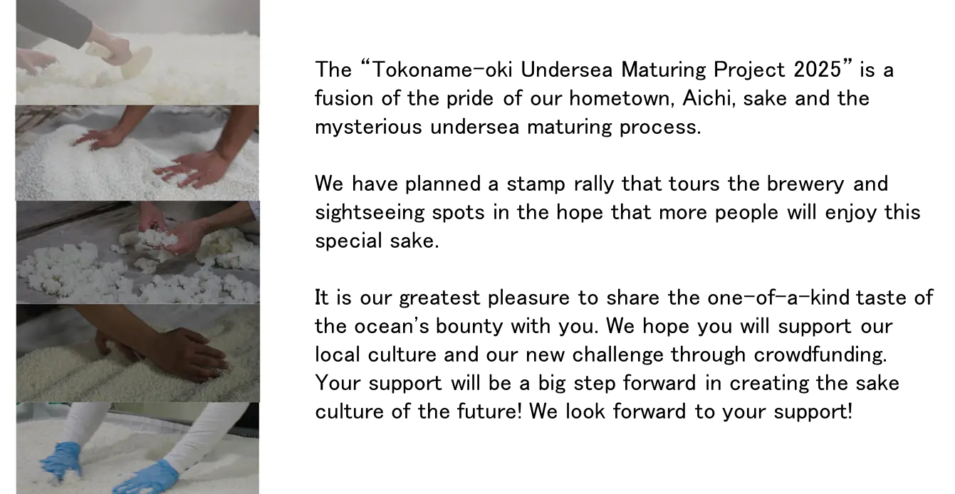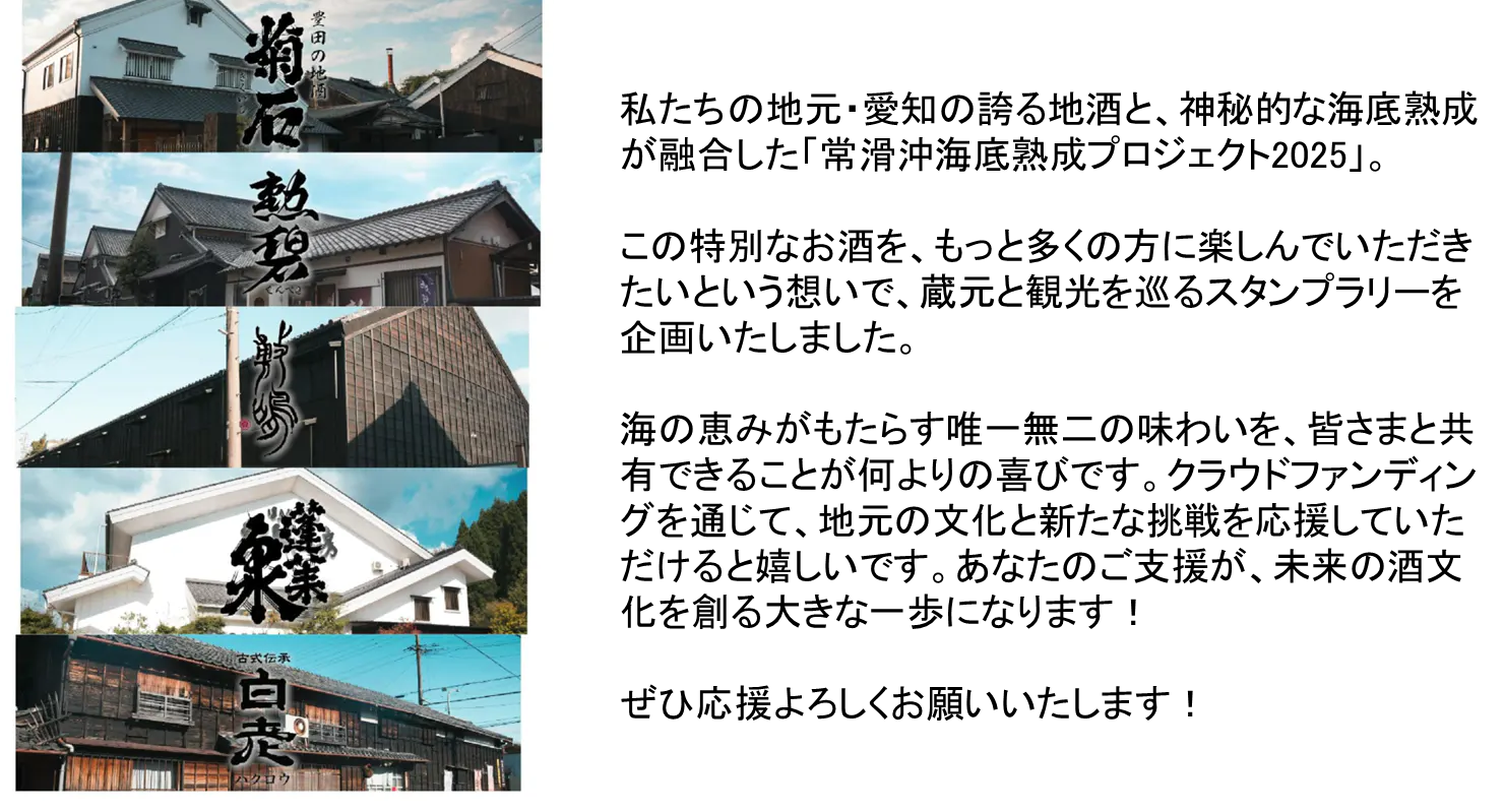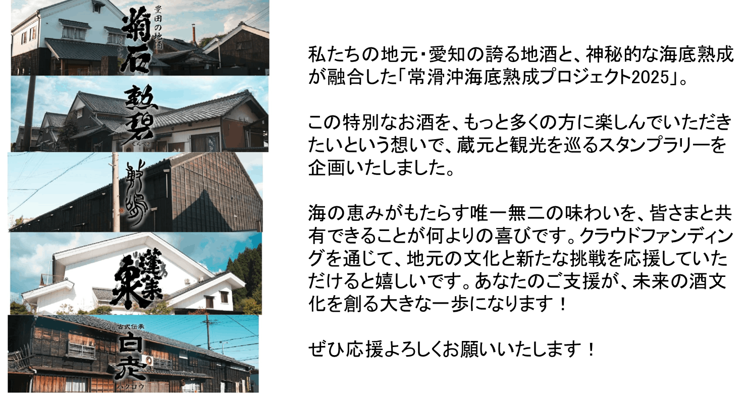 そこで私たちは、愛知県内の歴史ある酒造りと、日本酒文化の奥深さをもっと多くの人に知ってもらうため、「蔵めぐりスタンプラリー」や常滑鬼崎沖海底で熟成された珍しい「海底熟成酒」の体験イベントを開催する予定です