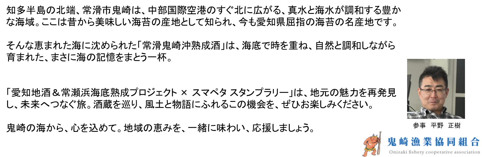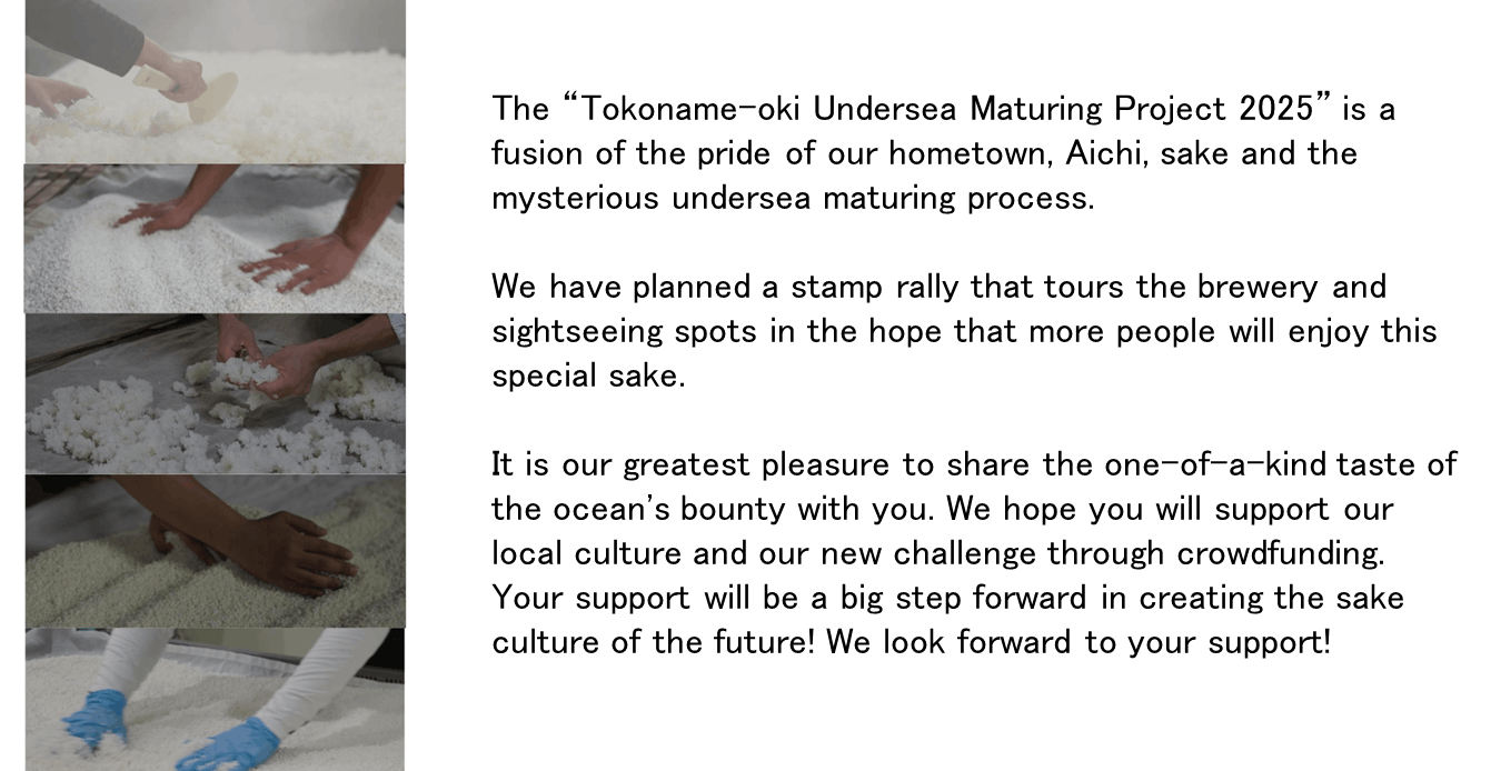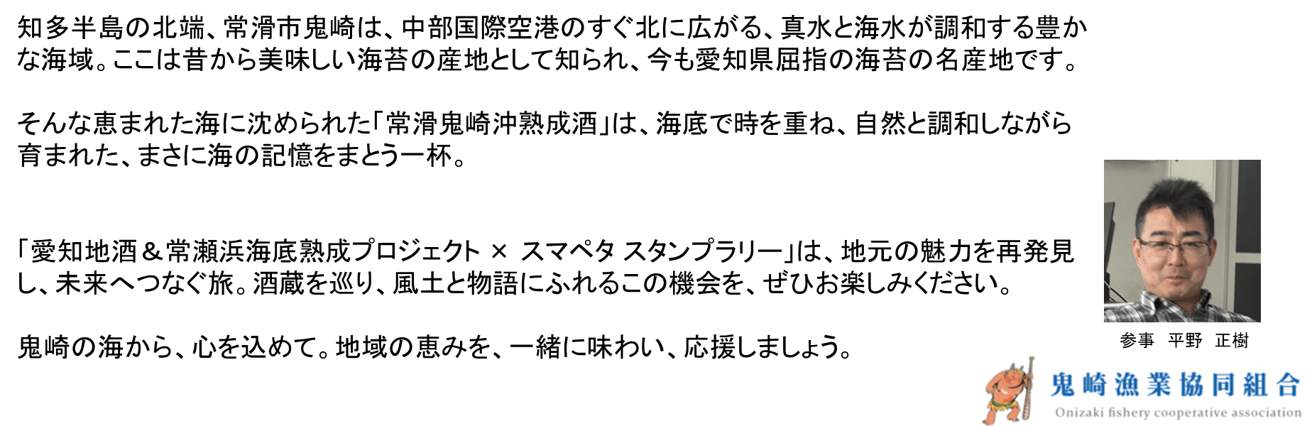 そこで私たちは、愛知県内の歴史ある酒造りと、日本酒文化の奥深さをもっと多くの人に知ってもらうため、「蔵めぐりスタンプラリー」や常滑鬼崎沖海底で熟成された珍しい「海底熟成酒」の体験イベントを開催する予定です