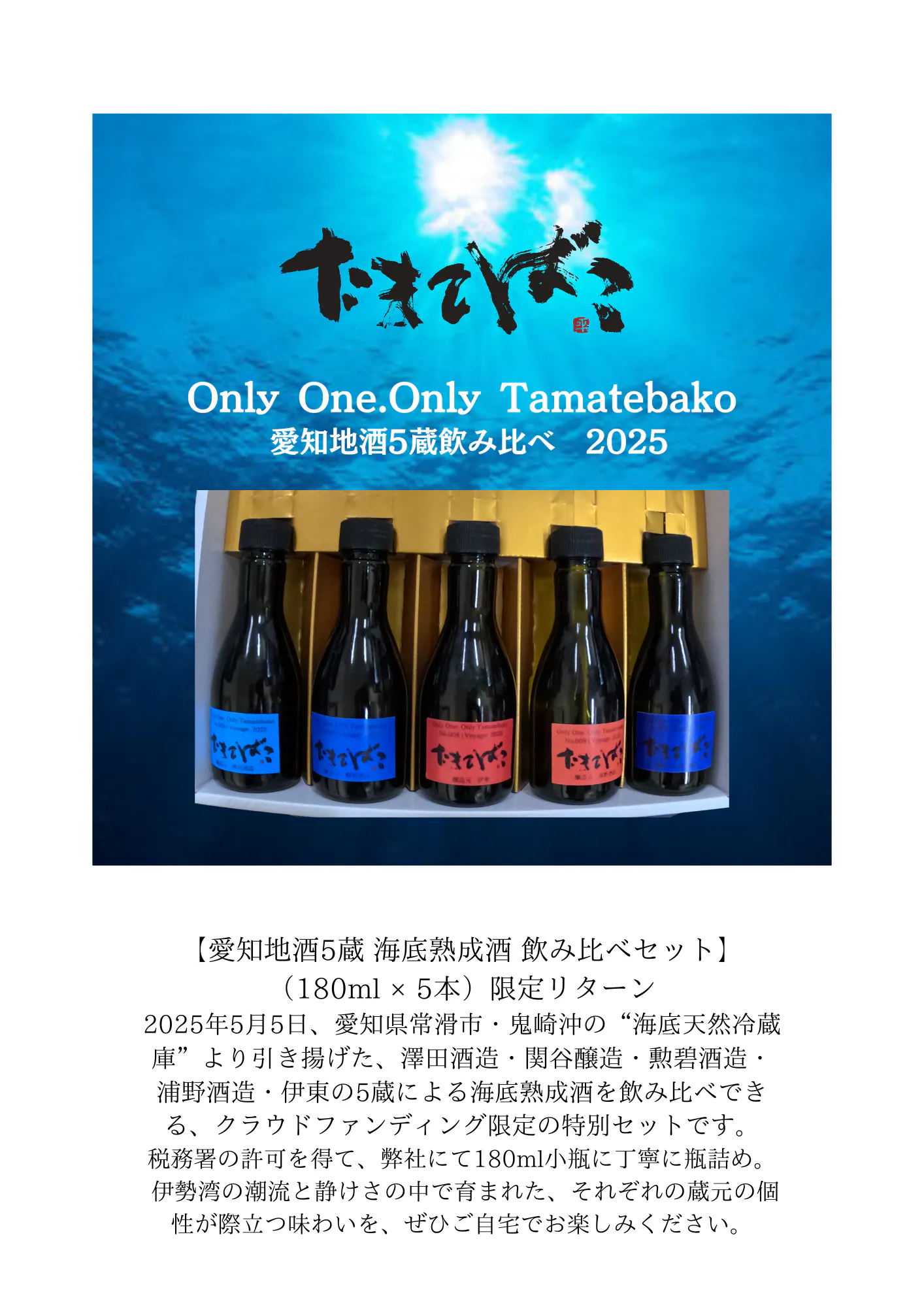 2025年海底で半年間熟成された今年愛知地酒5蔵の日本酒も特別なリターンとしてご用意させていただきます。