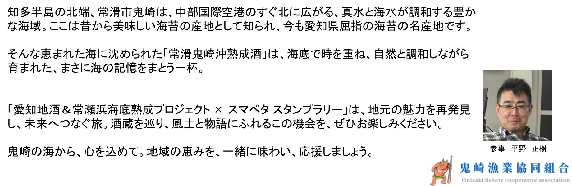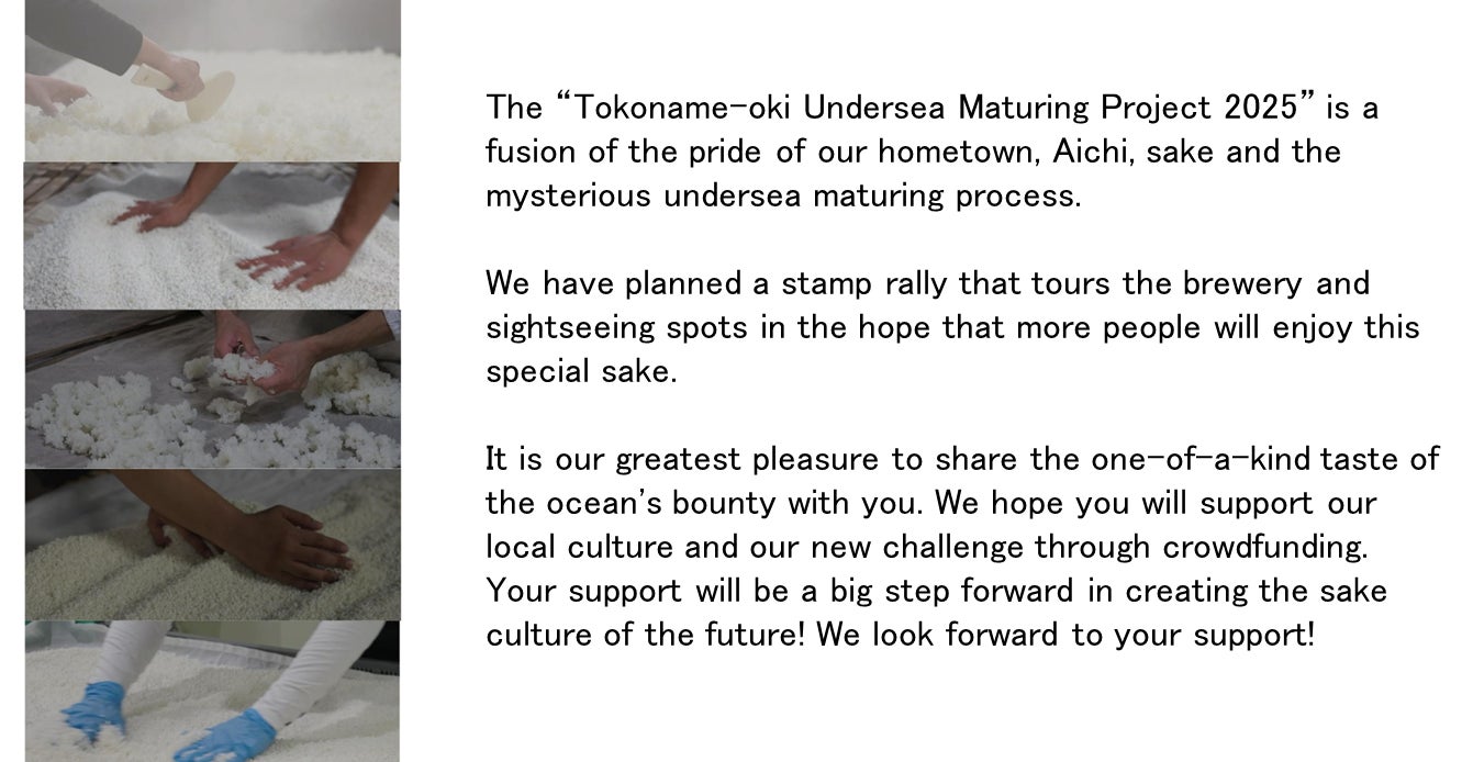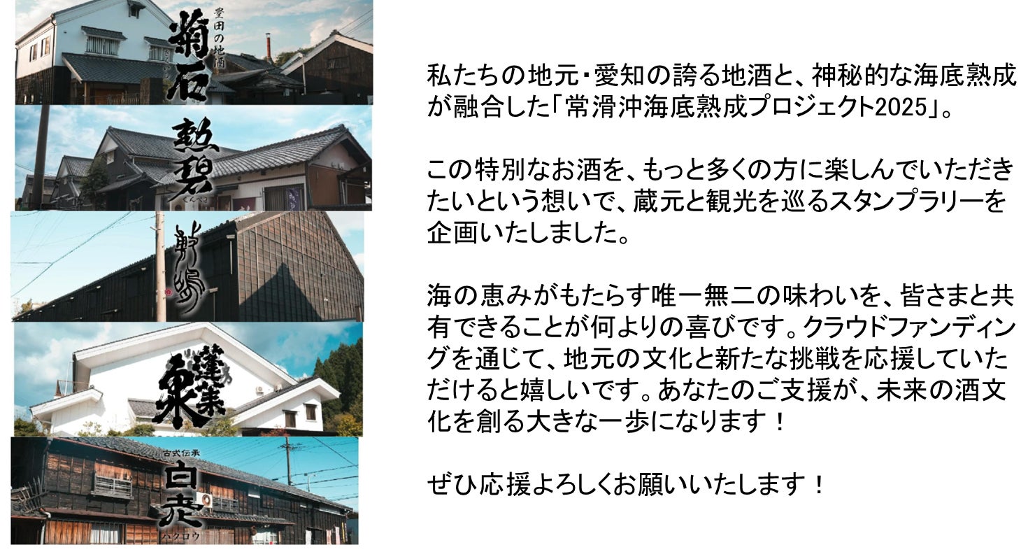そこで私たちは、愛知県内の歴史ある酒造りと、日本酒文化の奥深さをもっと多くの人に知ってもらうため、「蔵めぐりスタンプラリー」や常滑鬼崎沖海底で熟成された珍しい「海底熟成酒」の体験イベントを開催する予定です